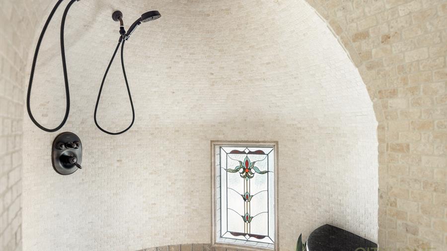 Upstairs, the owner's suite invites retreat and reflection. Generous in scale, it features an en suite bath where a turreted shower evokes the whimsy of a European castle.