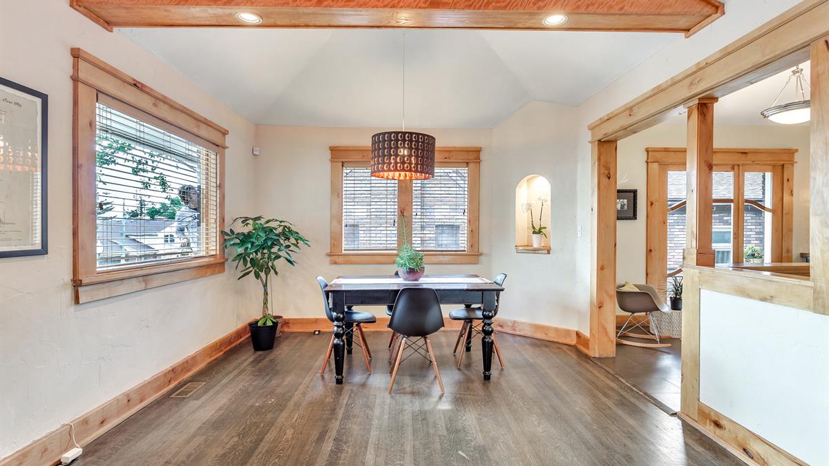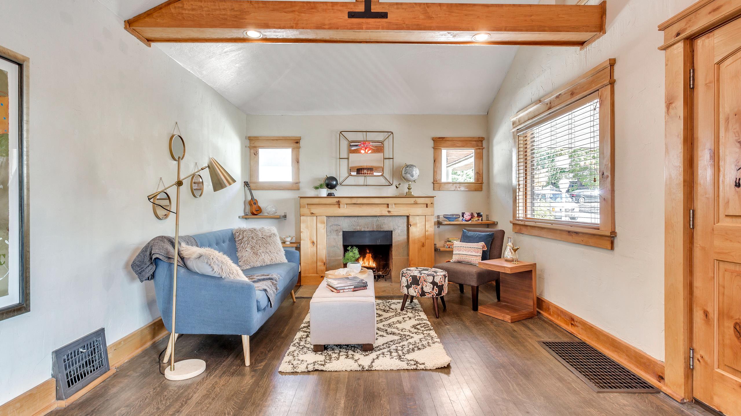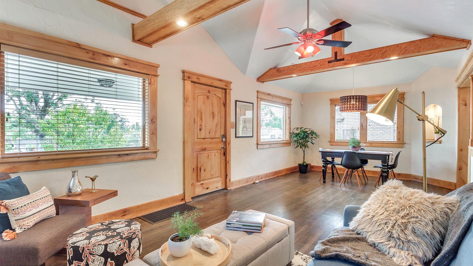 The inside is tastefully updated and awash in natural light, and those high ceilings and exposed oak beams make this space feel plenty big.