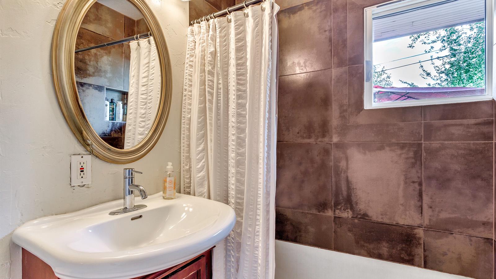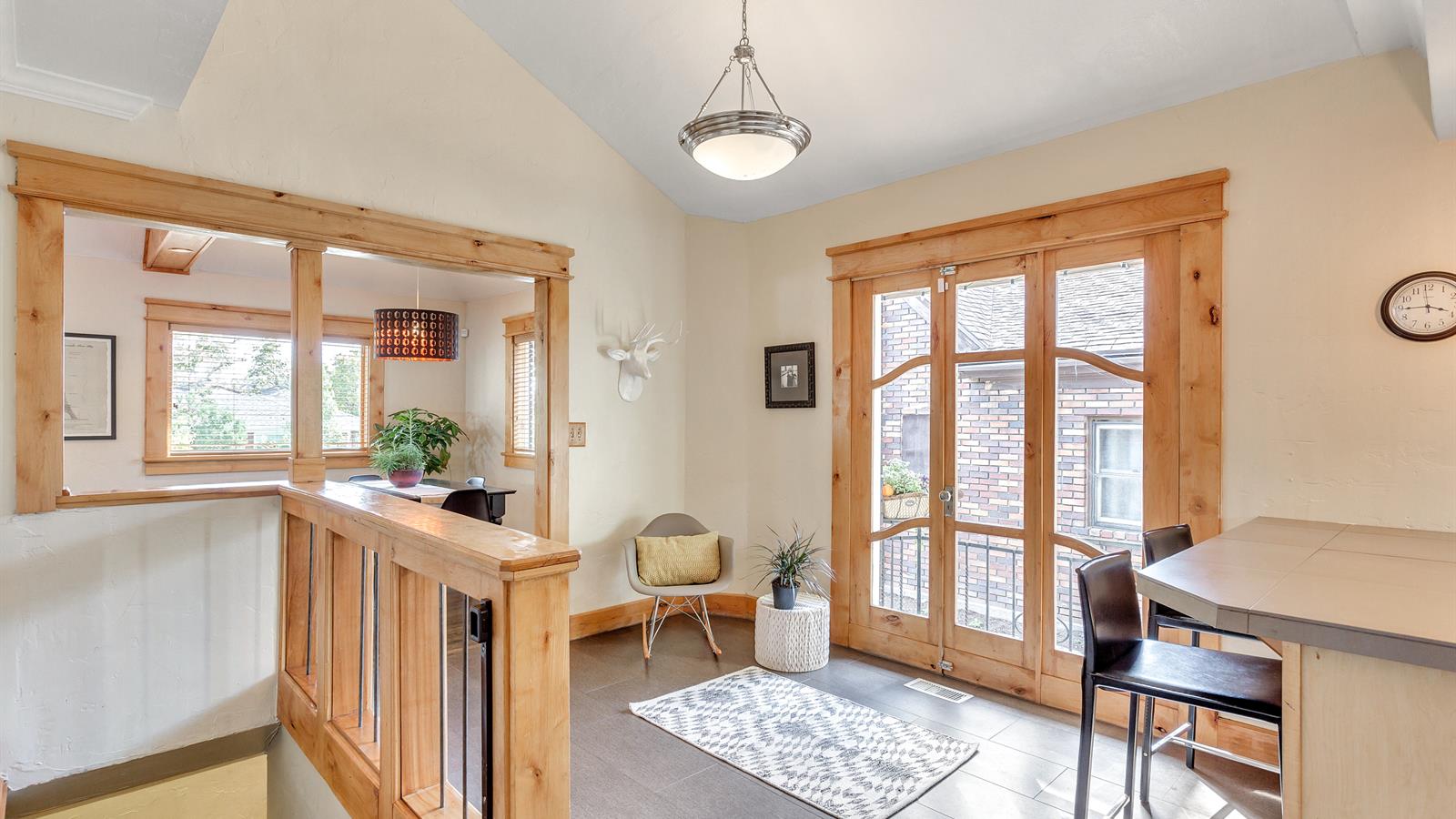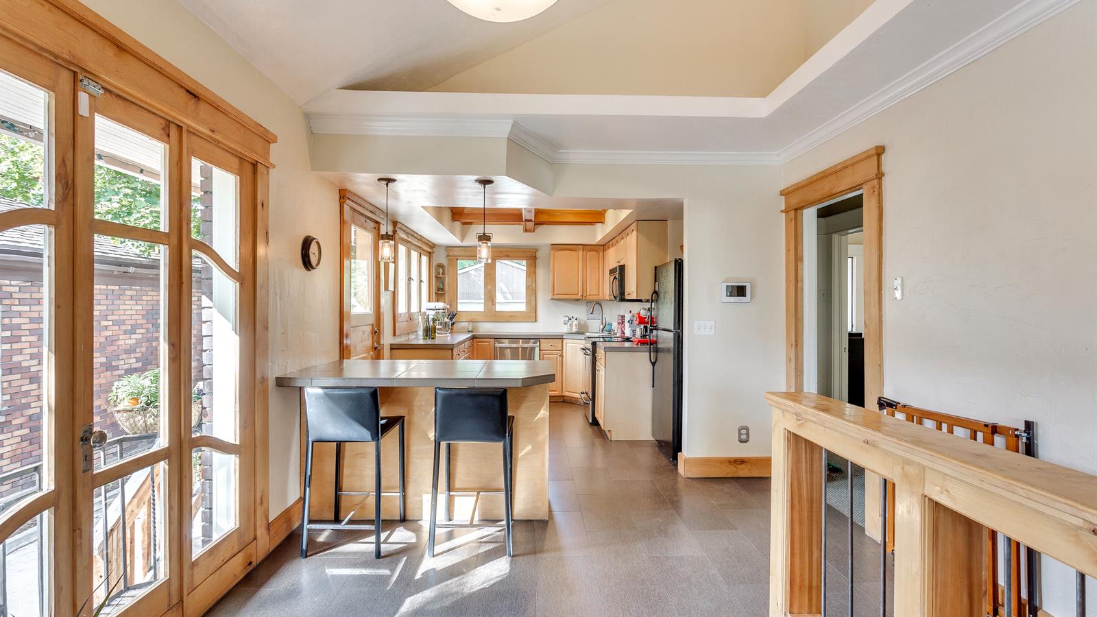 The inside is tastefully updated and awash in natural light, and those high ceilings and exposed oak beams make this space feel plenty big.