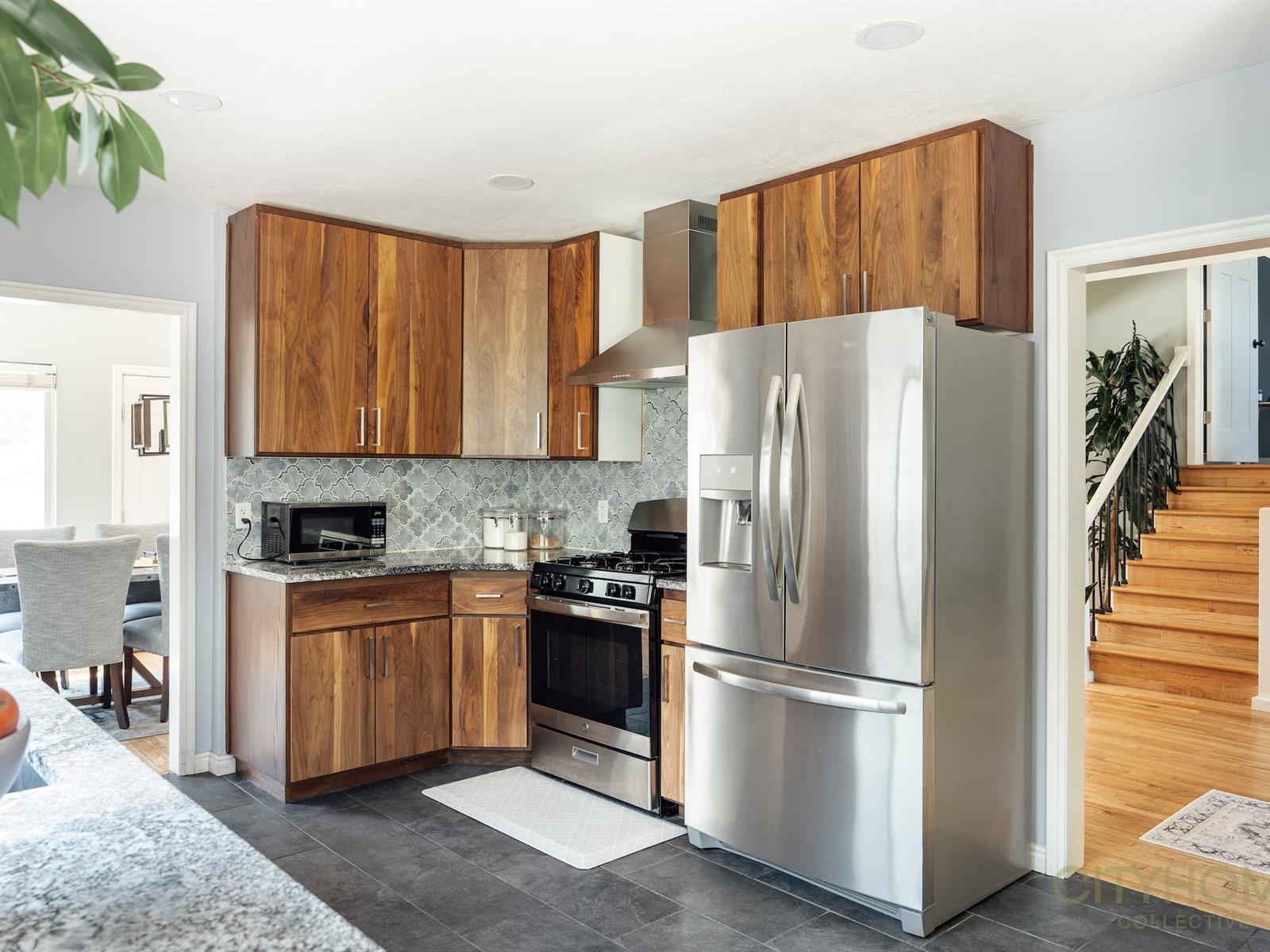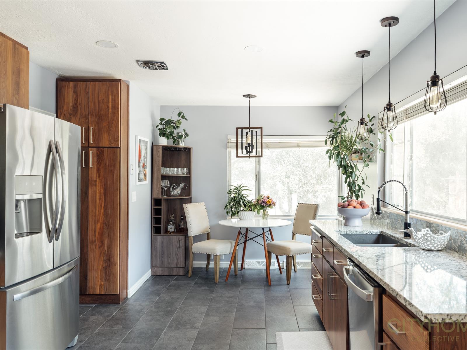 think vintage vibes meets modern magic, complete with custom upgrades. Natural light floods the main level, featuring original hardwood floors and an open layout with space for an office nook or sitting area, living room with cozy fireplace, and spacious dining area. At the heart is the completely remodeled kitchen - from its sleek walnut cabinets to its stylish slate floor and granite countertops - with all new appliances and lighting.