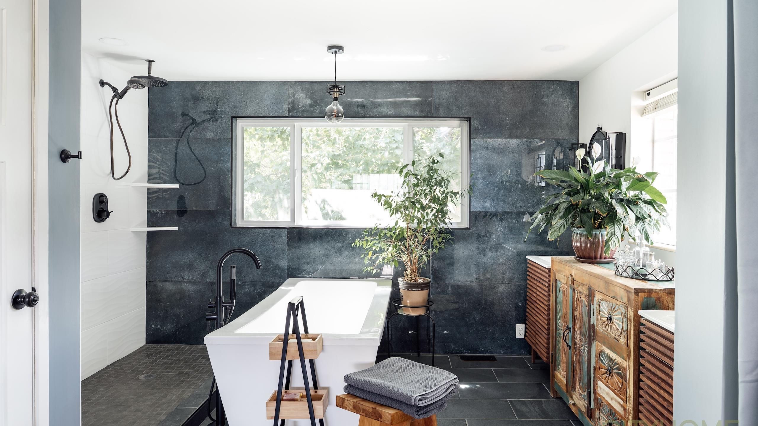 Upstairs, what was once a traditional layout has been reimagined as a dreamy primary suite with a spa-like atmosphere.