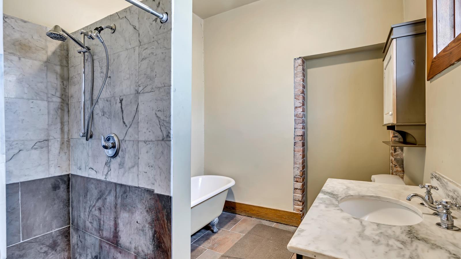 Tall ceilings throughout lend plenty of charm, as do the updated bathrooms—all of which contain beautiful tile work and one of which includes a claw foot tub.