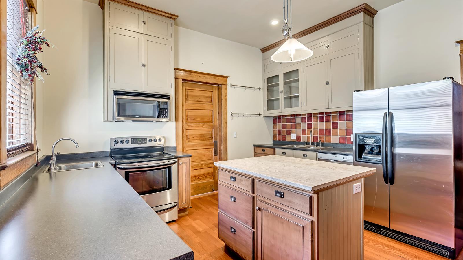 Updated but still in line with the rest of the home, the kitchen features a sizable island as well as a butler’s pantry with original cabinetry.