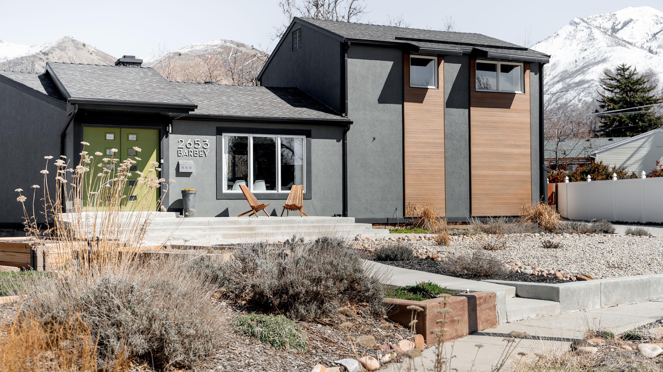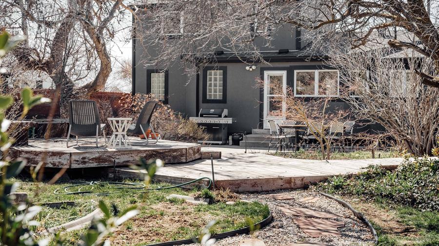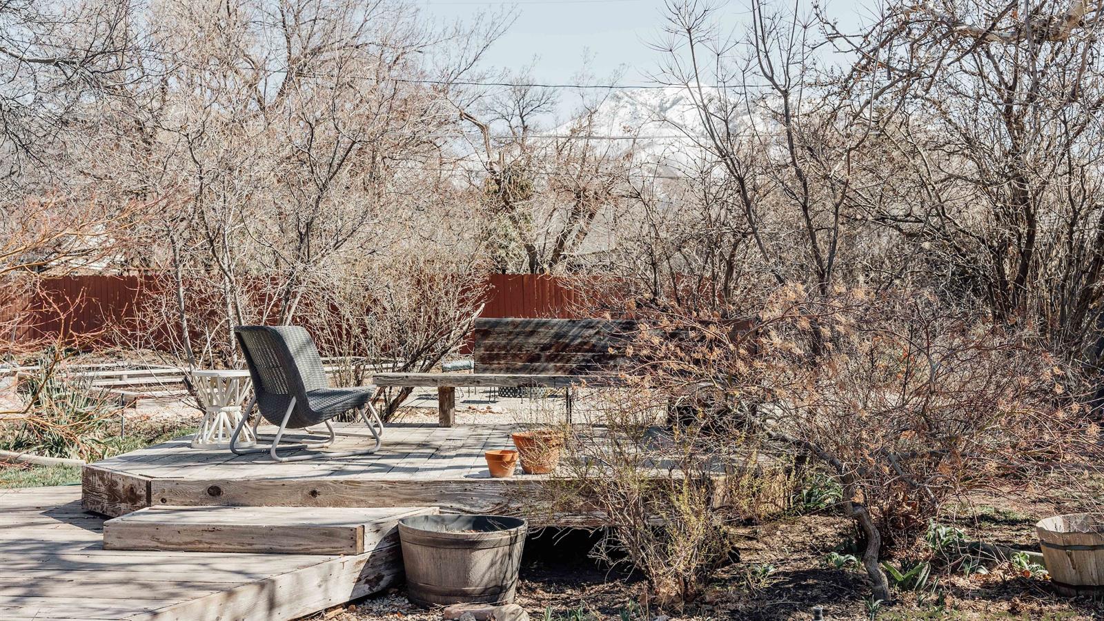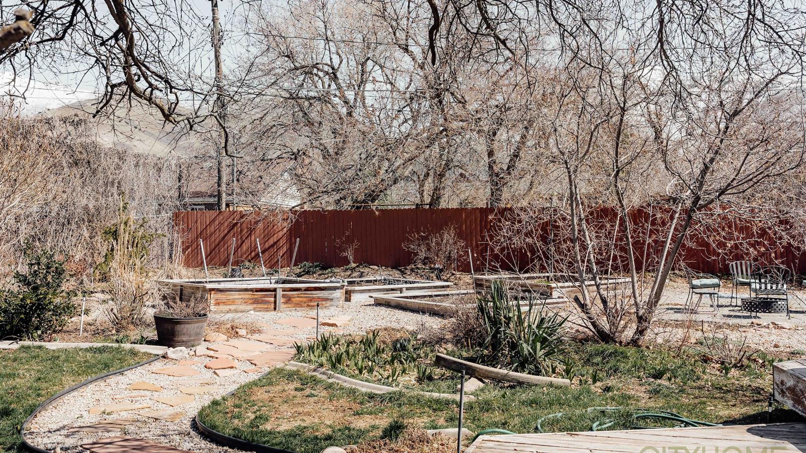 The backyard is a sanctuary teeming with life. From large trees, and generous garden boxes, to windy gravel paths, the space offers an oasis nestled at the base of the Wasatch Front.