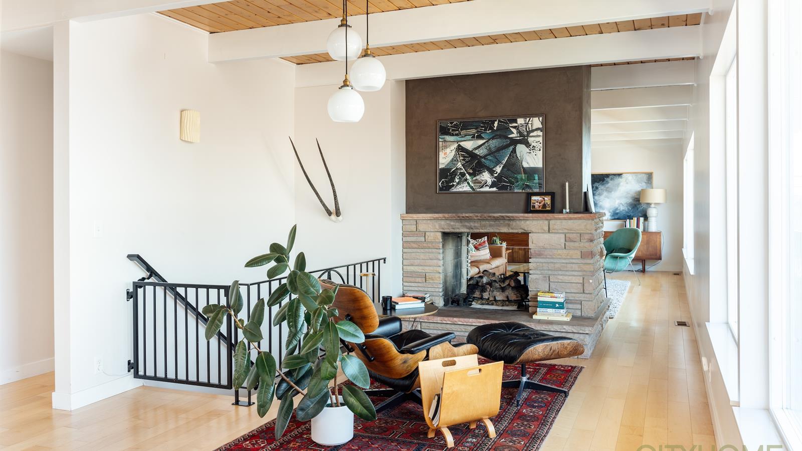 Two cozy living spaces connected by a see through fireplace allow for uninterrupted cityscape gazing.