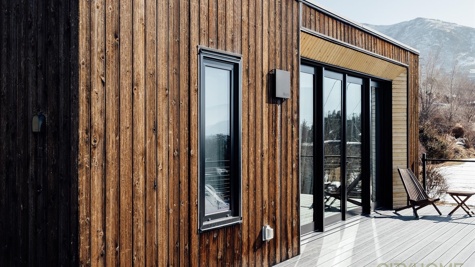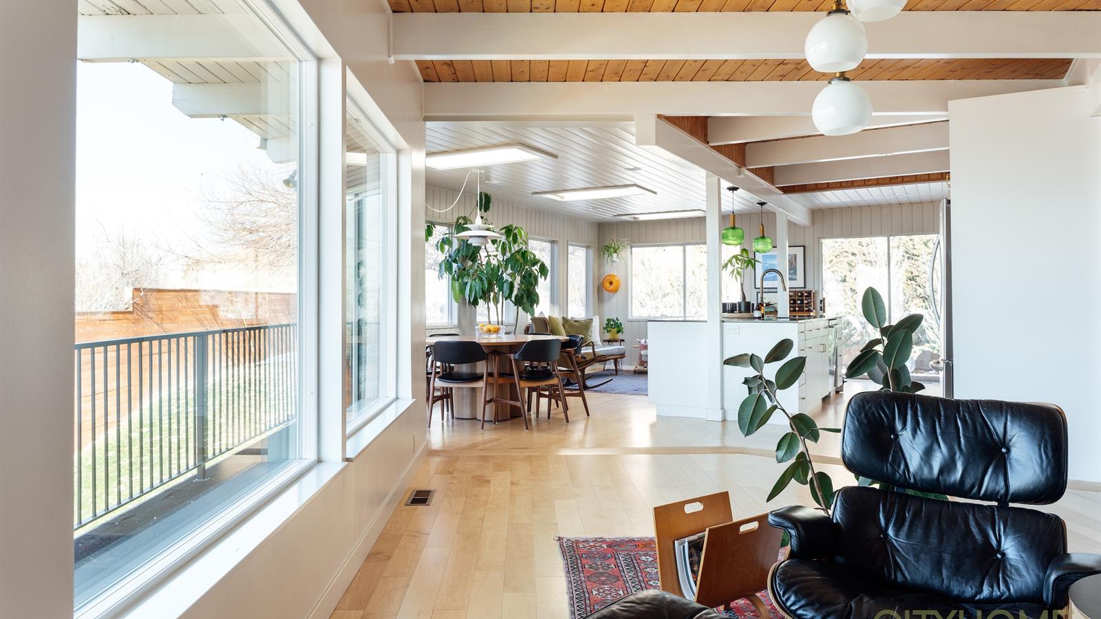 Elements such as floor to ceiling windows and exposed beamwork create a space that intimately connects the indoors to the out.
