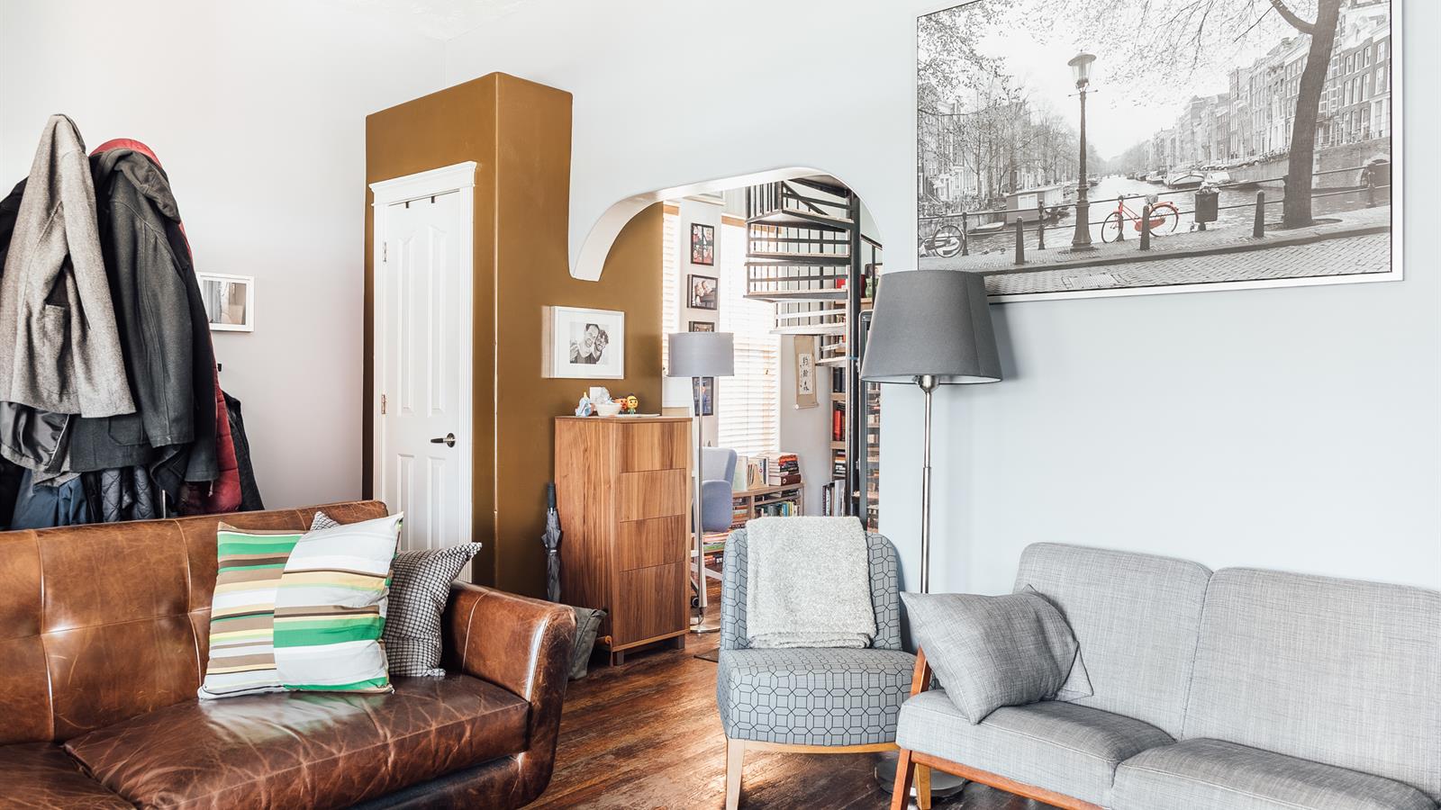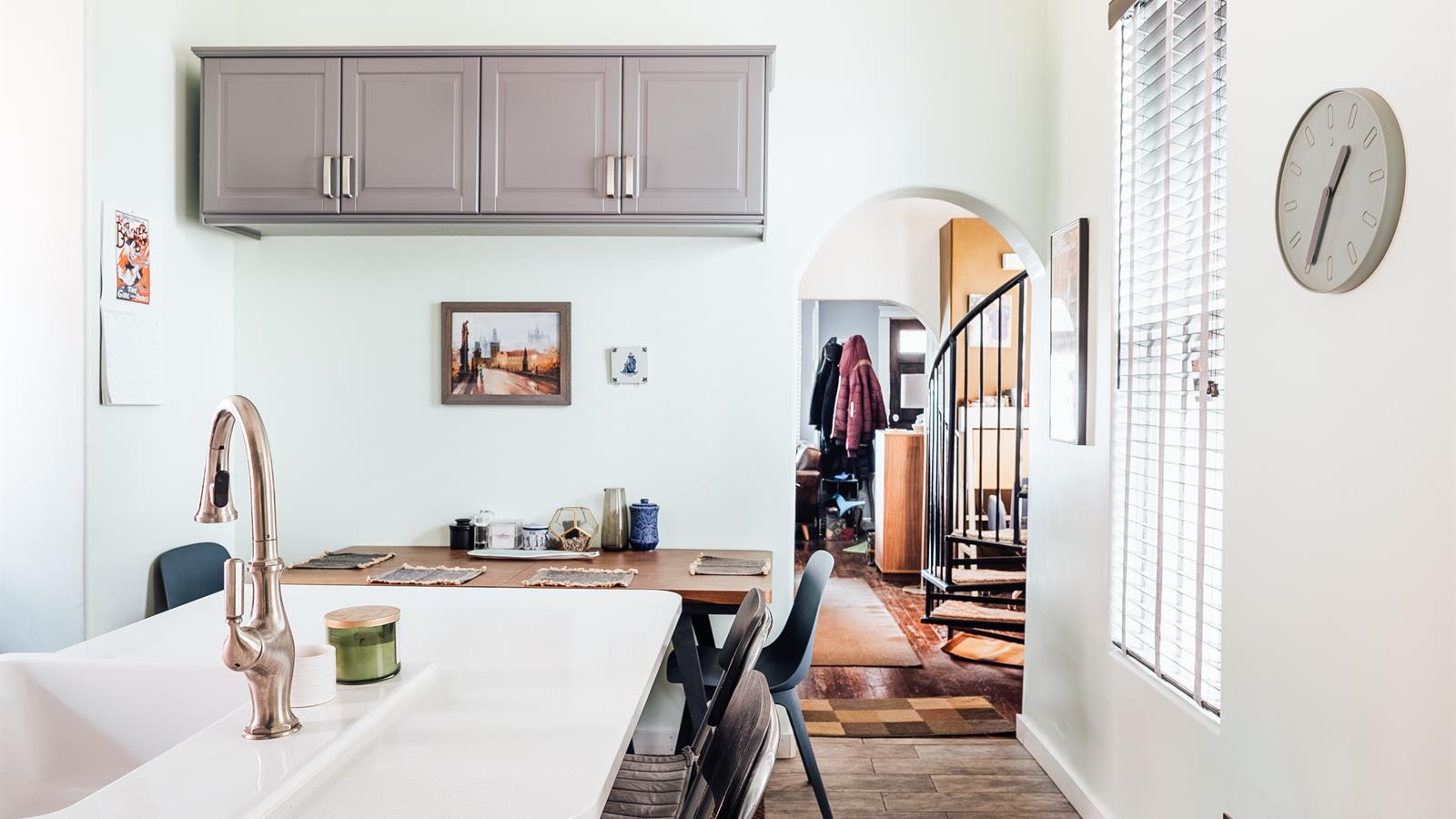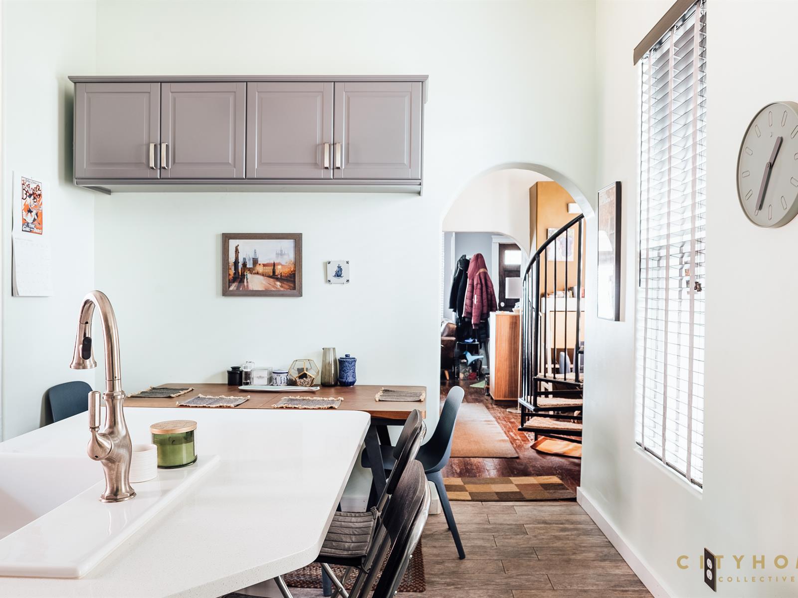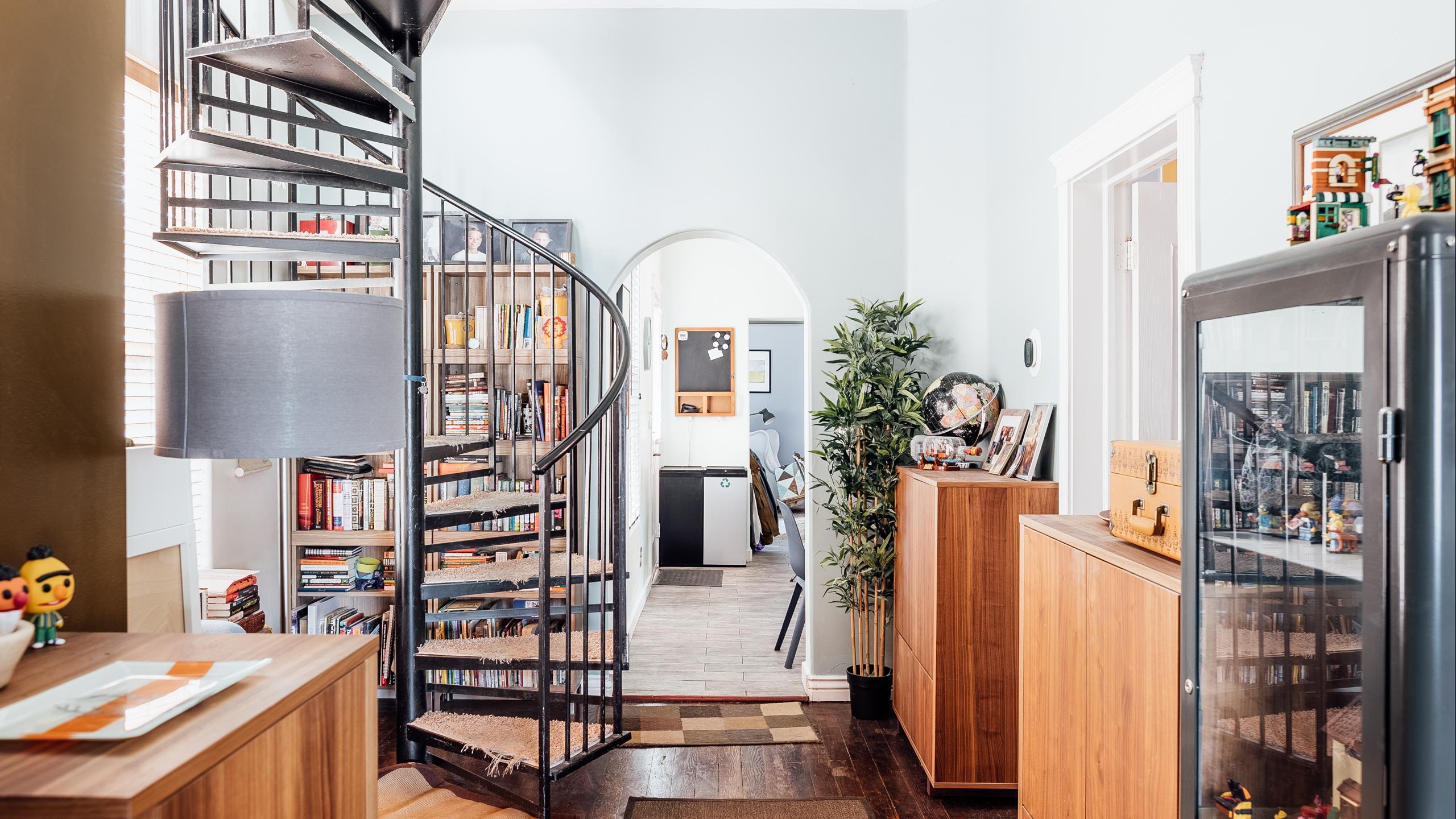 This spot deftly marries modern conveniences with charming historical components such as high ceilings, hardwood floors, a bay window, and an incredible spiral staircase.