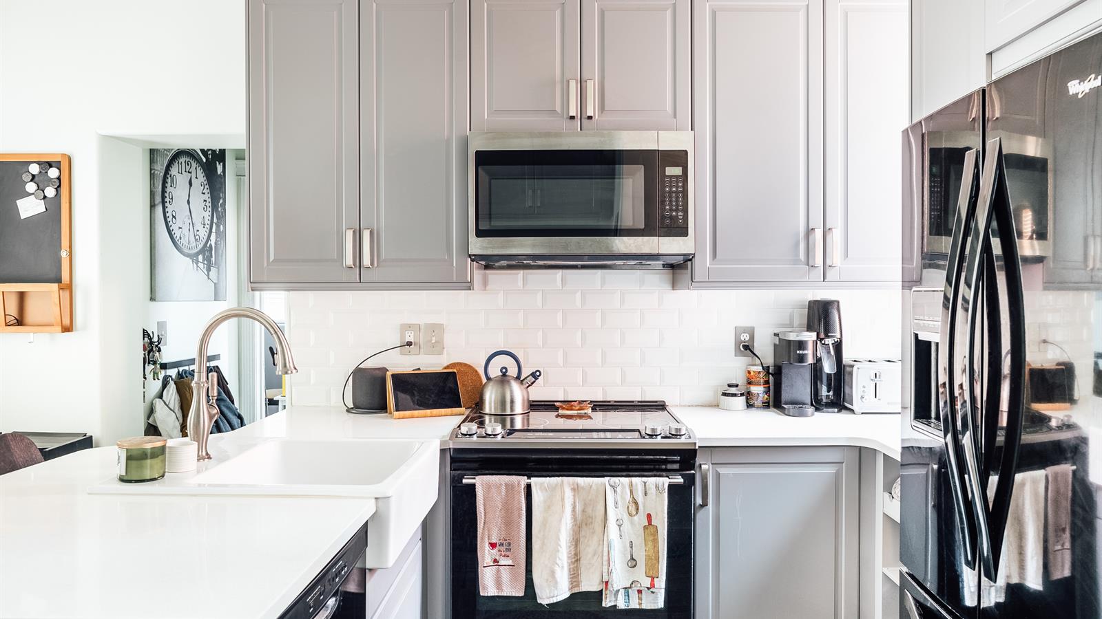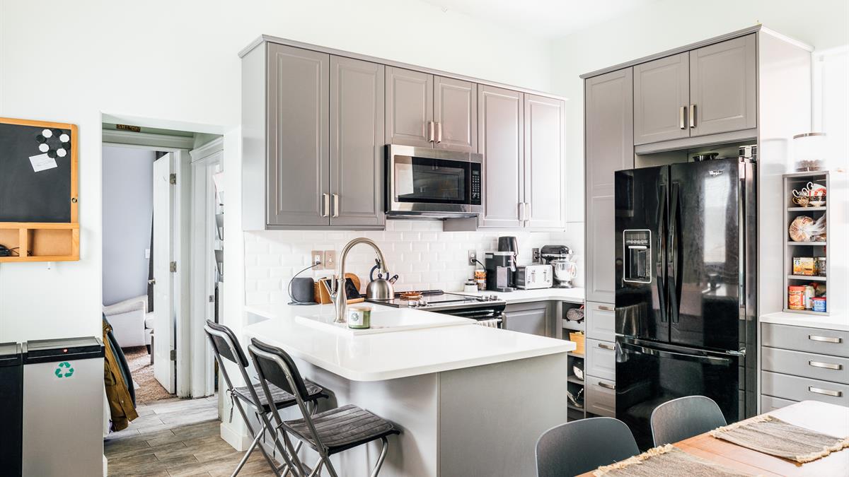 Complete with new cabinets, plenty of storage space, quartz countertops, and new appliances, the kitchen is the perfect place to practice all manner of culinary techniques.