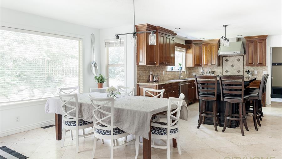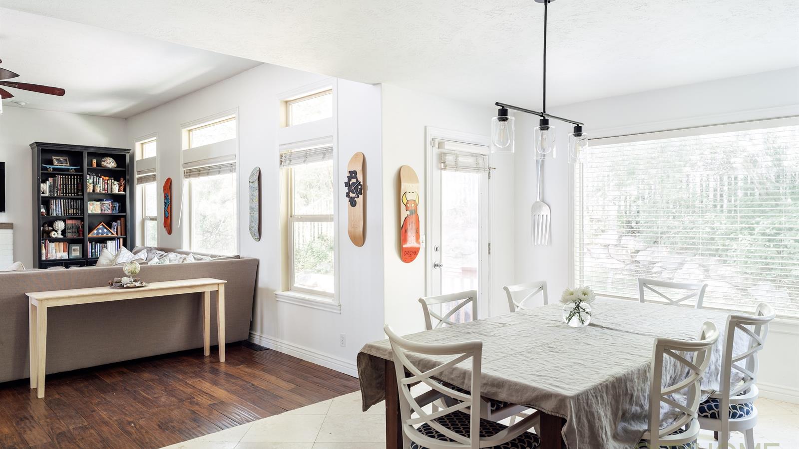 The thoughtfully designed layout is open for easy flow and connection (think fun family birthdays or lively friend gatherings), yet offers many distinct spaces to find a quiet haven. The large kitchen, outfitted with granite countertops and new appliances, connects seamlessly to an inviting dining and living space, where high ceilings and large windows allow for abundant natural light.
