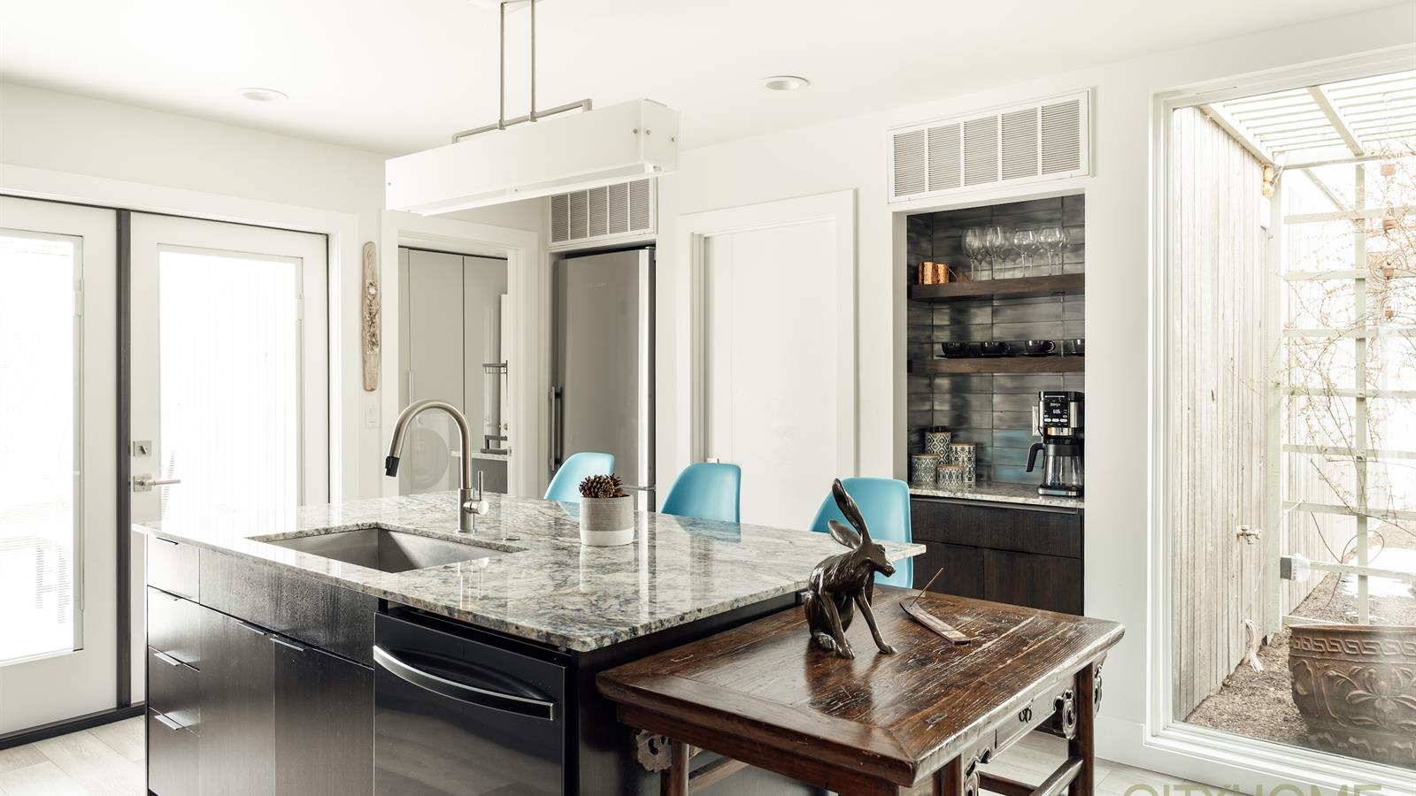 The kitchen has been redesigned and relocated and now boasts a new gas range, new cabinetry, new granite counters and stainless steel appliances. New flooring runs throughout the home along with new sheetrock, new, solid-core doors, and new plumbing. The electrical is also new with increased amperage to the home via a new panel. The windows and doors are all high efficiency and, adding architectural detail and functionality, 6 new floor-to-ceiling windows were added.