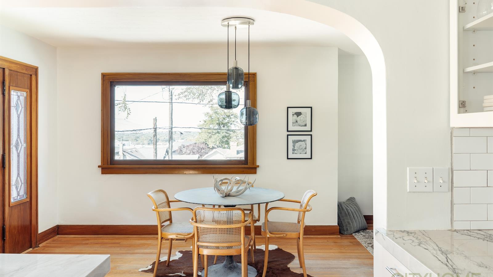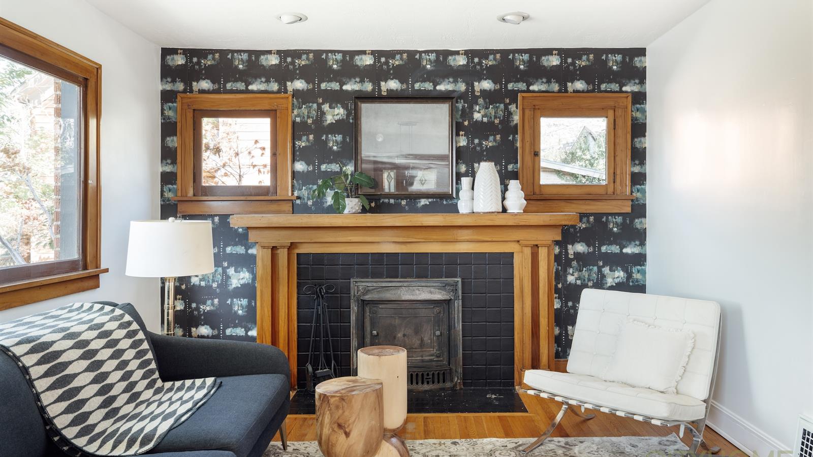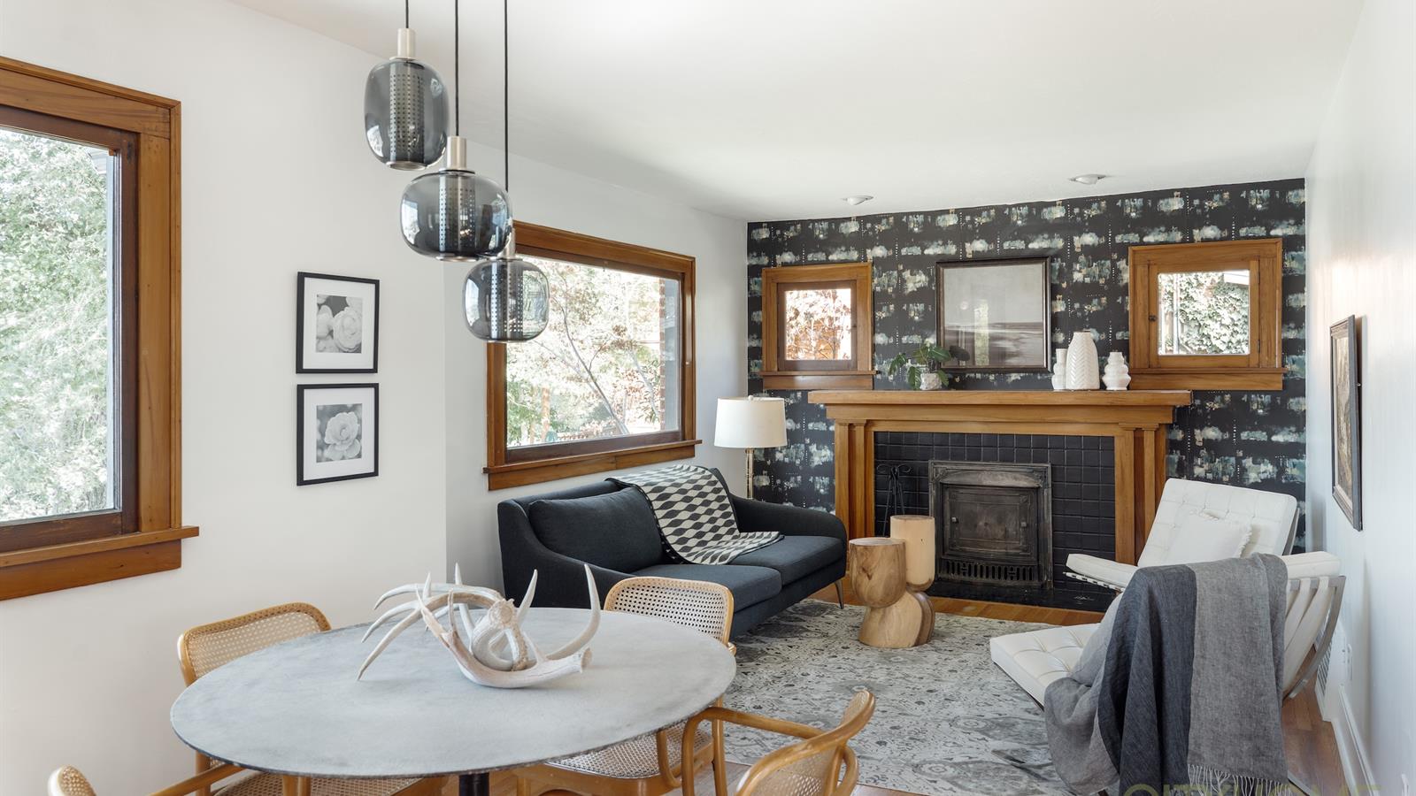 Step through the original triptych pink-stained glass front door, and you’ll enter a dining and living area anchored by the original wood mantel and tile hearth, accented with playful deep-blue wallpaper that flows seamlessly into the bright, updated kitchen—a warm, functional layout designed for effortless hosting. The kitchen offers ample cabinet storage, a solid granite gathering island, a gas range, and a smart refrigerator.
