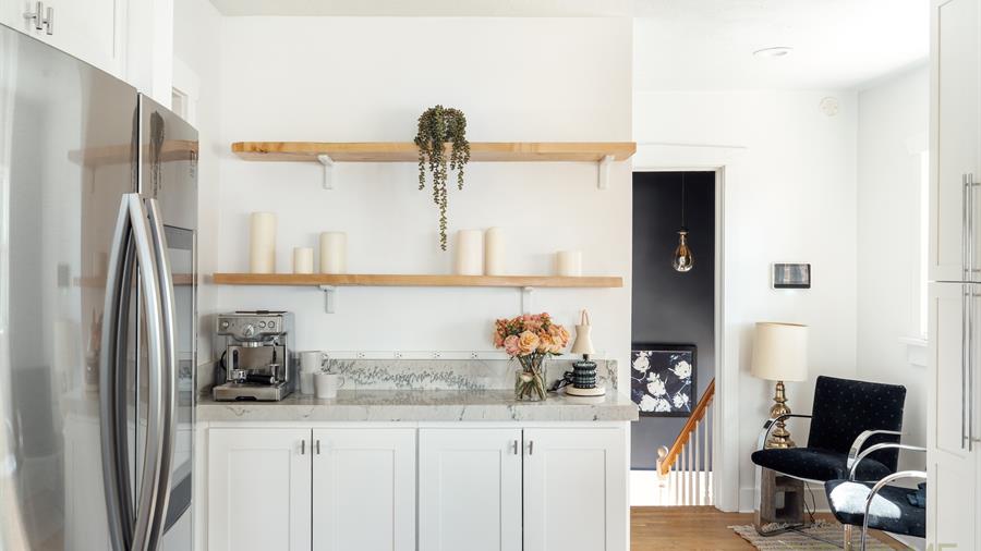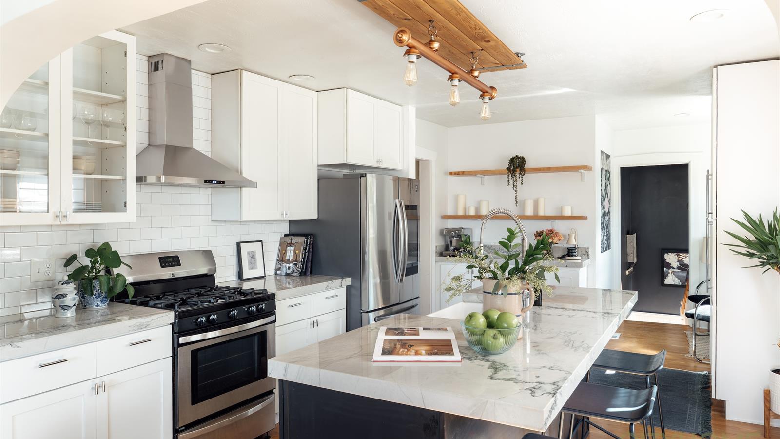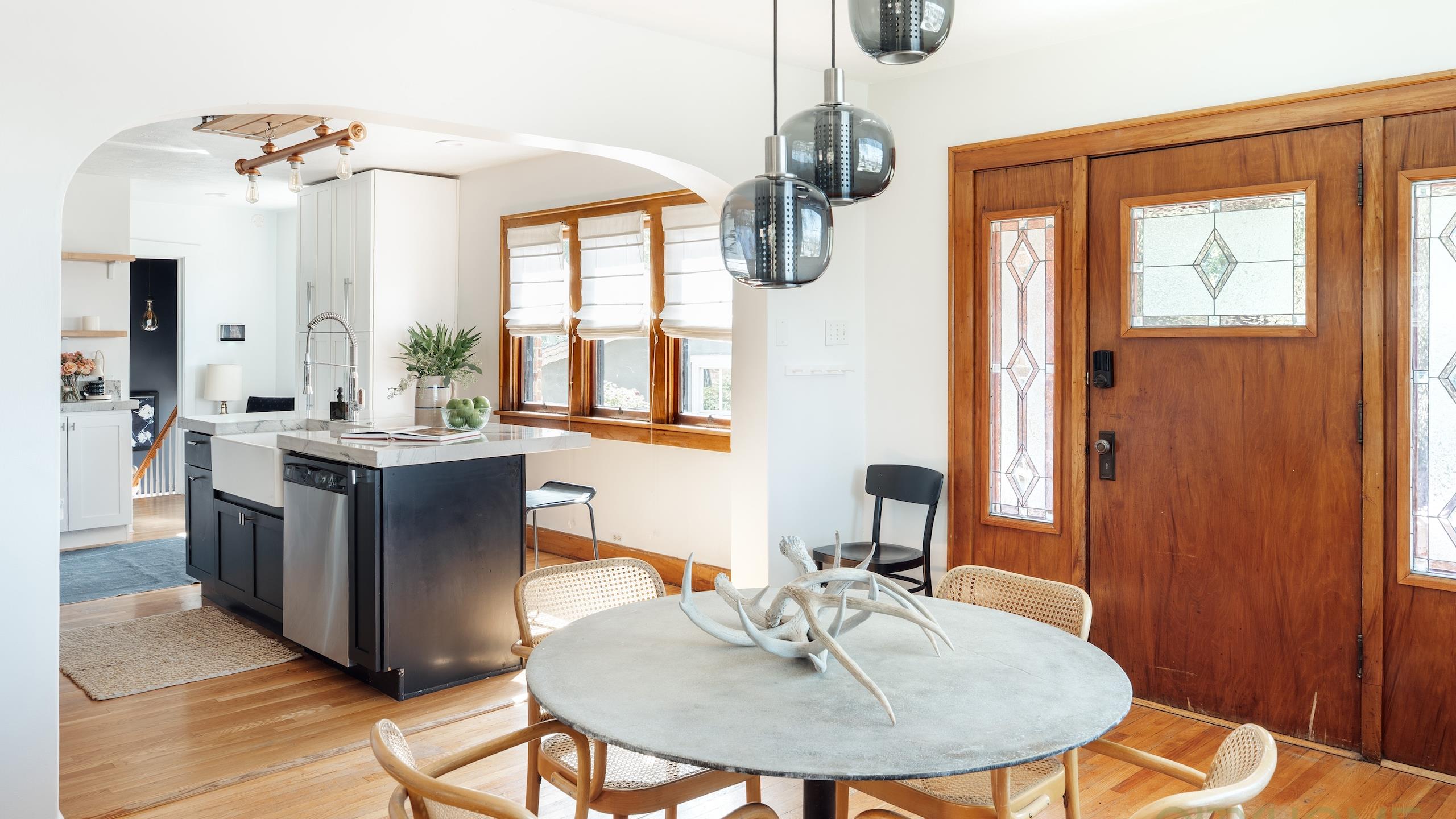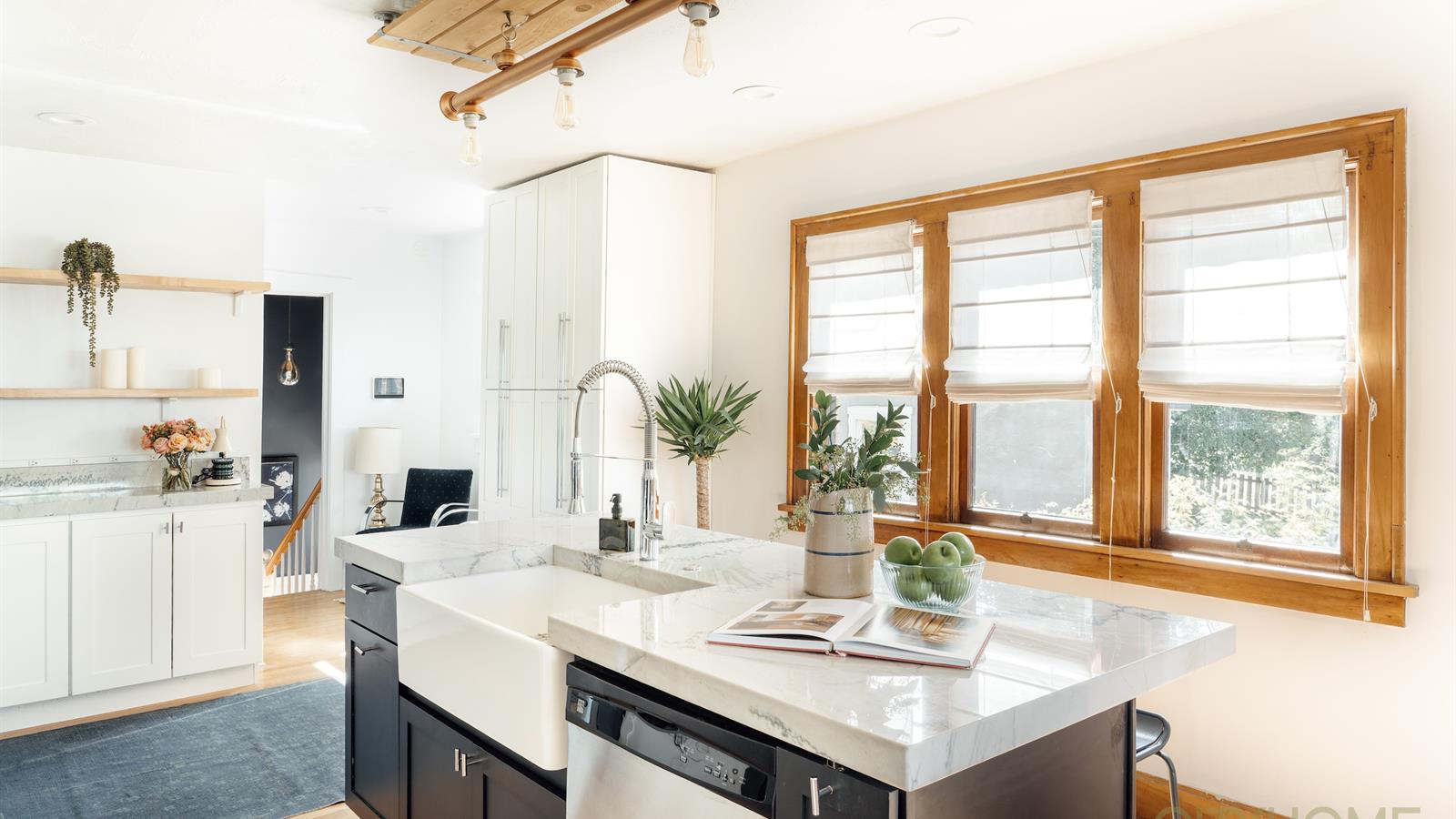 Step through the original triptych pink-stained glass front door, and you’ll enter a dining and living area anchored by the original wood mantel and tile hearth, accented with playful deep-blue wallpaper that flows seamlessly into the bright, updated kitchen—a warm, functional layout designed for effortless hosting. The kitchen offers ample cabinet storage, a solid granite gathering island, a gas range, and a smart refrigerator.