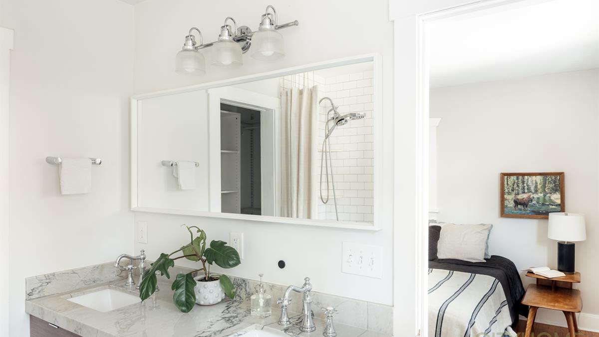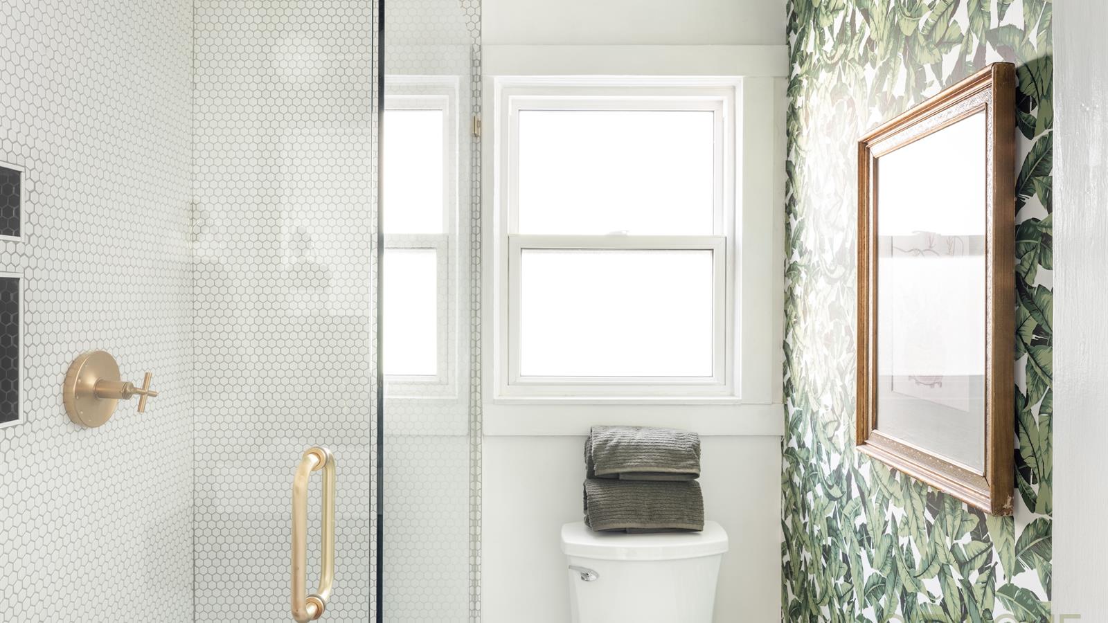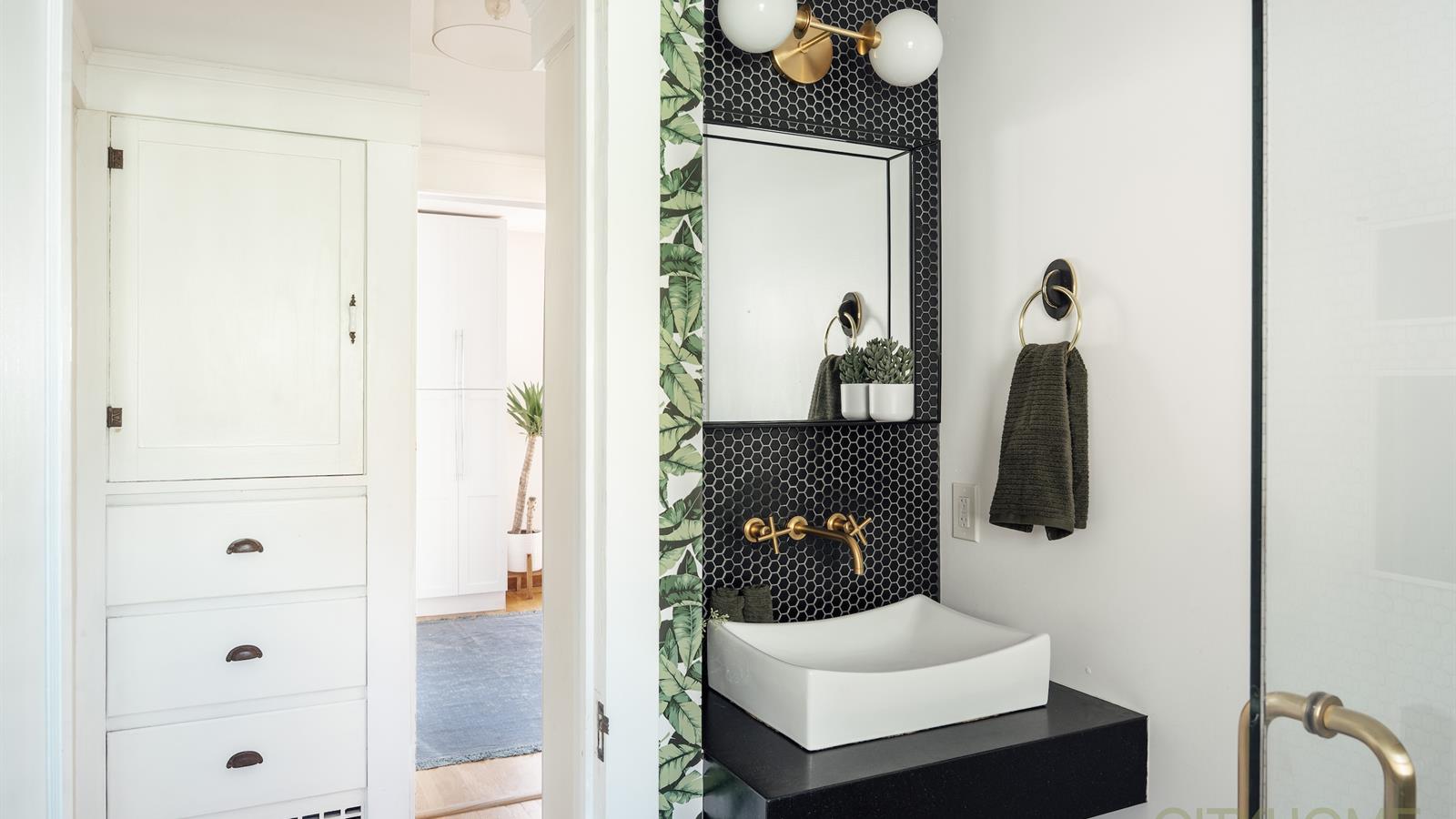 On the main floor there are two bedrooms and two baths, including a guest bath with bold tile and classic Martinique-esk wallpaper. In addition an unexpected en-suite, fit with soaking tub and a double vanity.