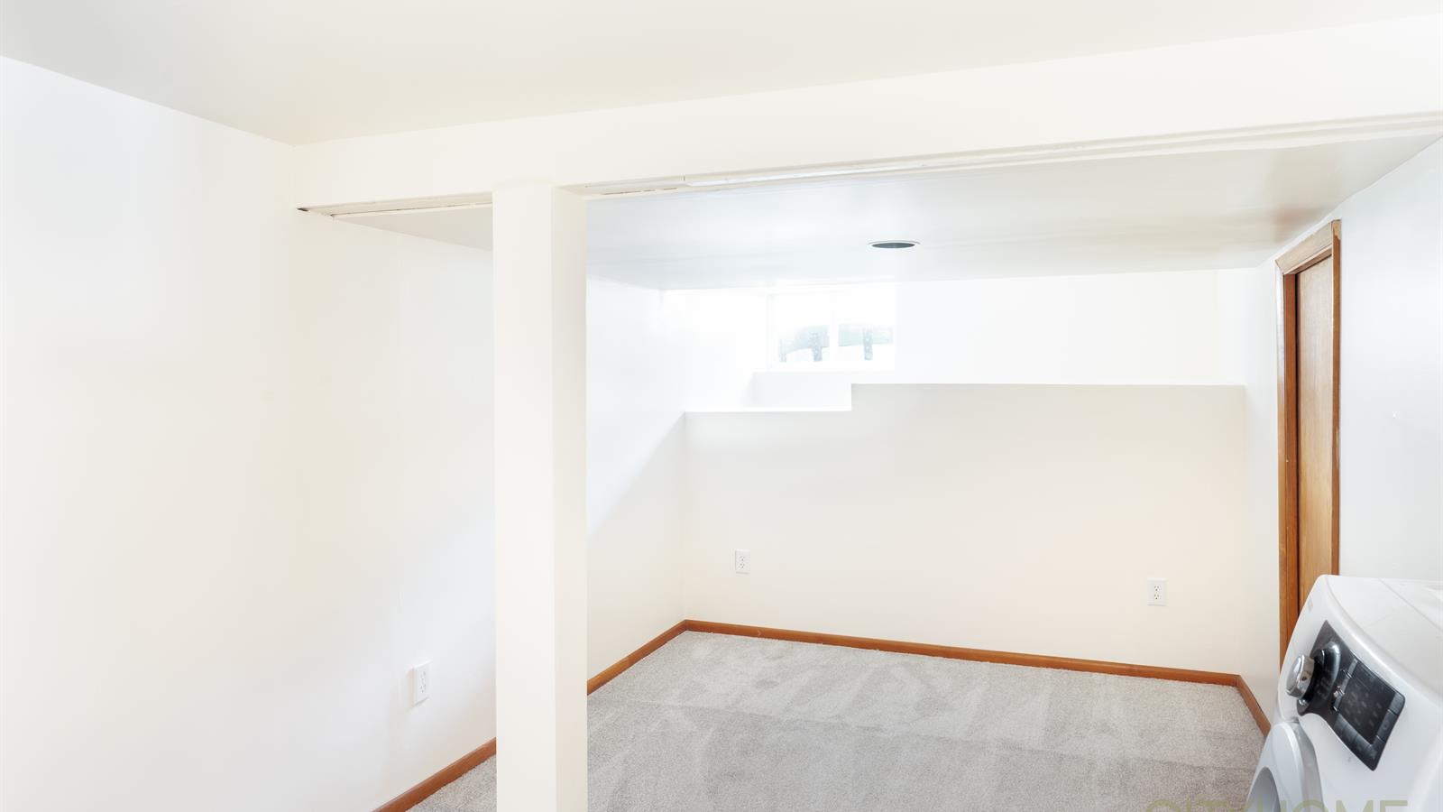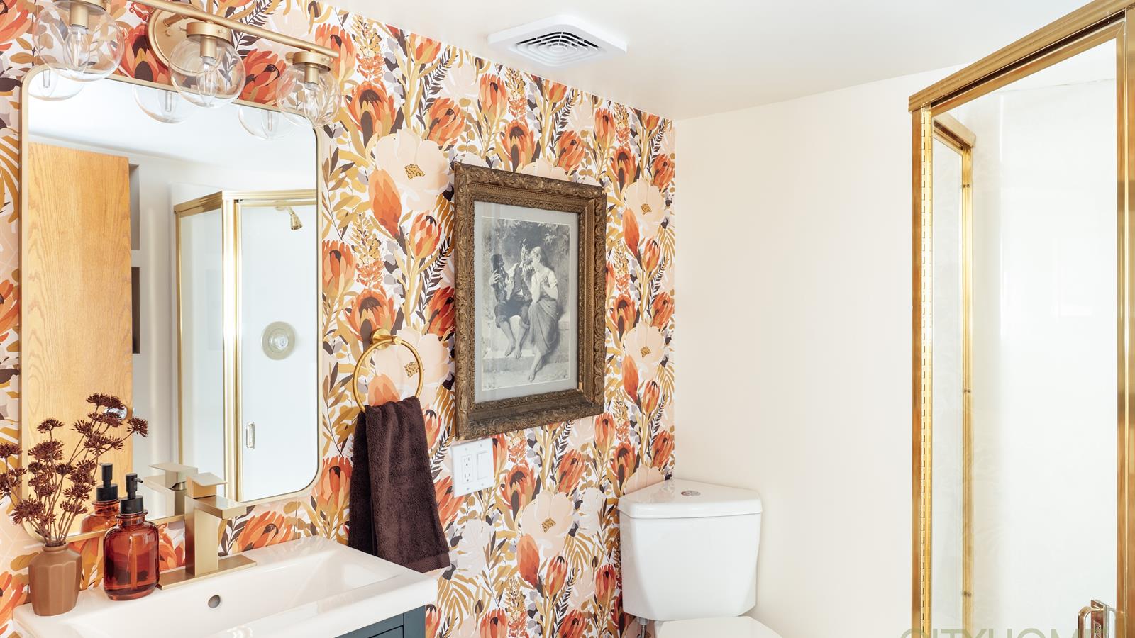Downstairs, a newly renovated bath—dressed in warm floral wallpaper and brass fixtures—sets the tone. A long, light-filled hallway with fresh carpet and stylish sconces leads to an expansive flex space. An additional room with side-by-side laundry offers endless possibilities: a sprawling closet or creative studio space. With some imagination, the home’s lower level can become a single floor suite, private guest quarters, or the ultimate lounge.