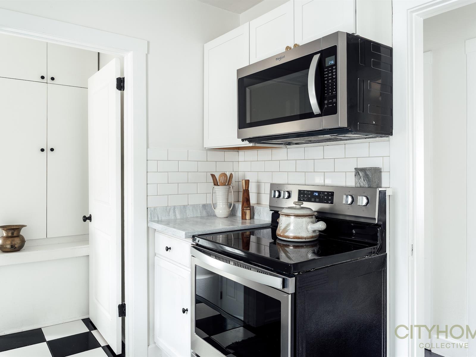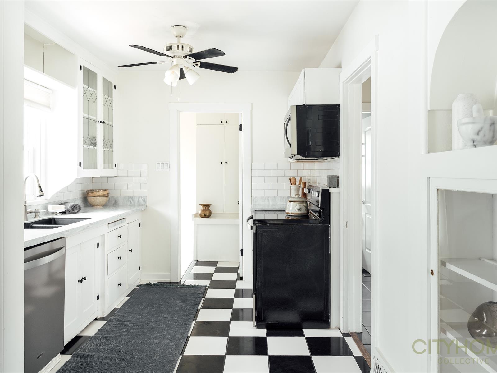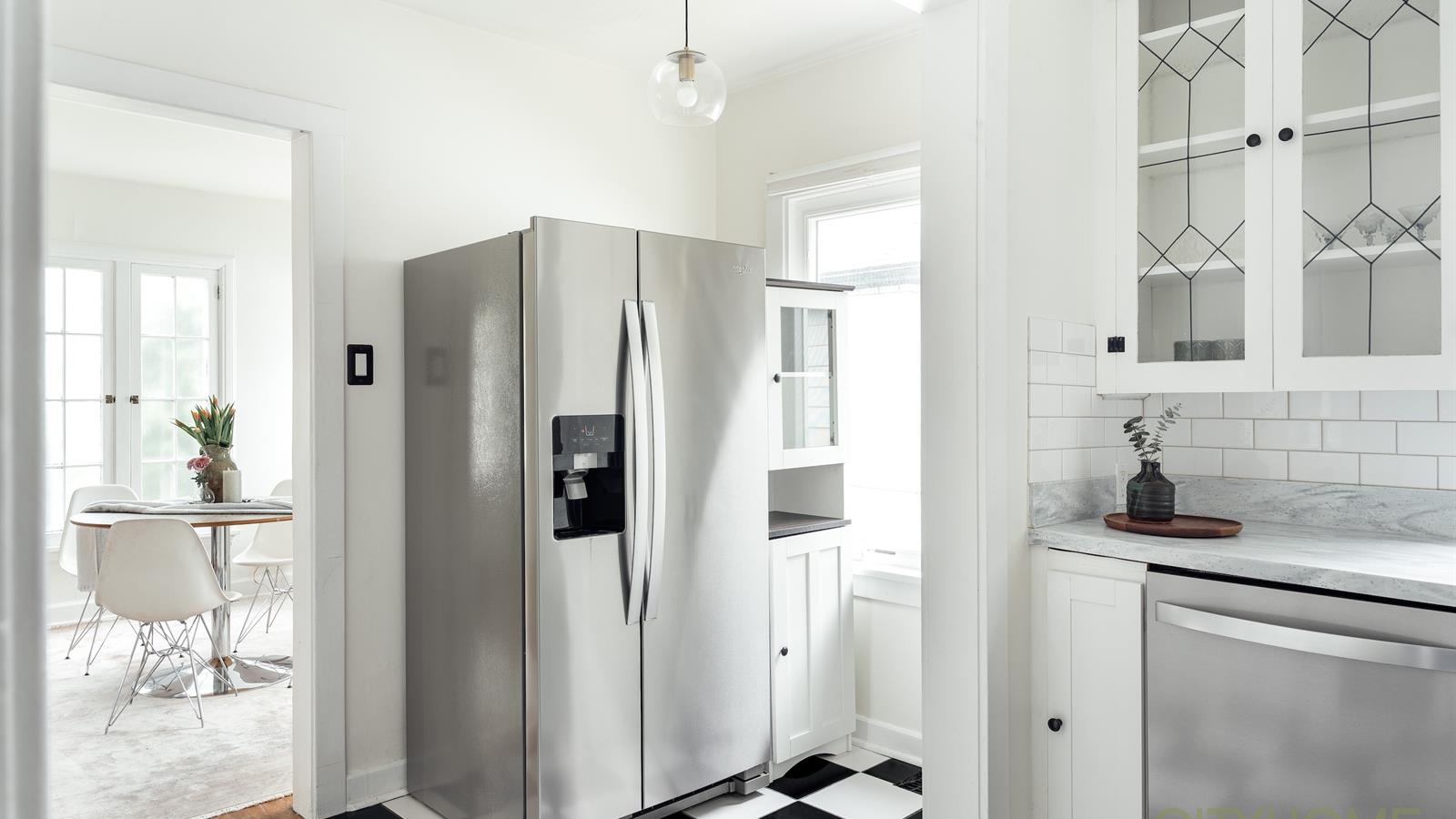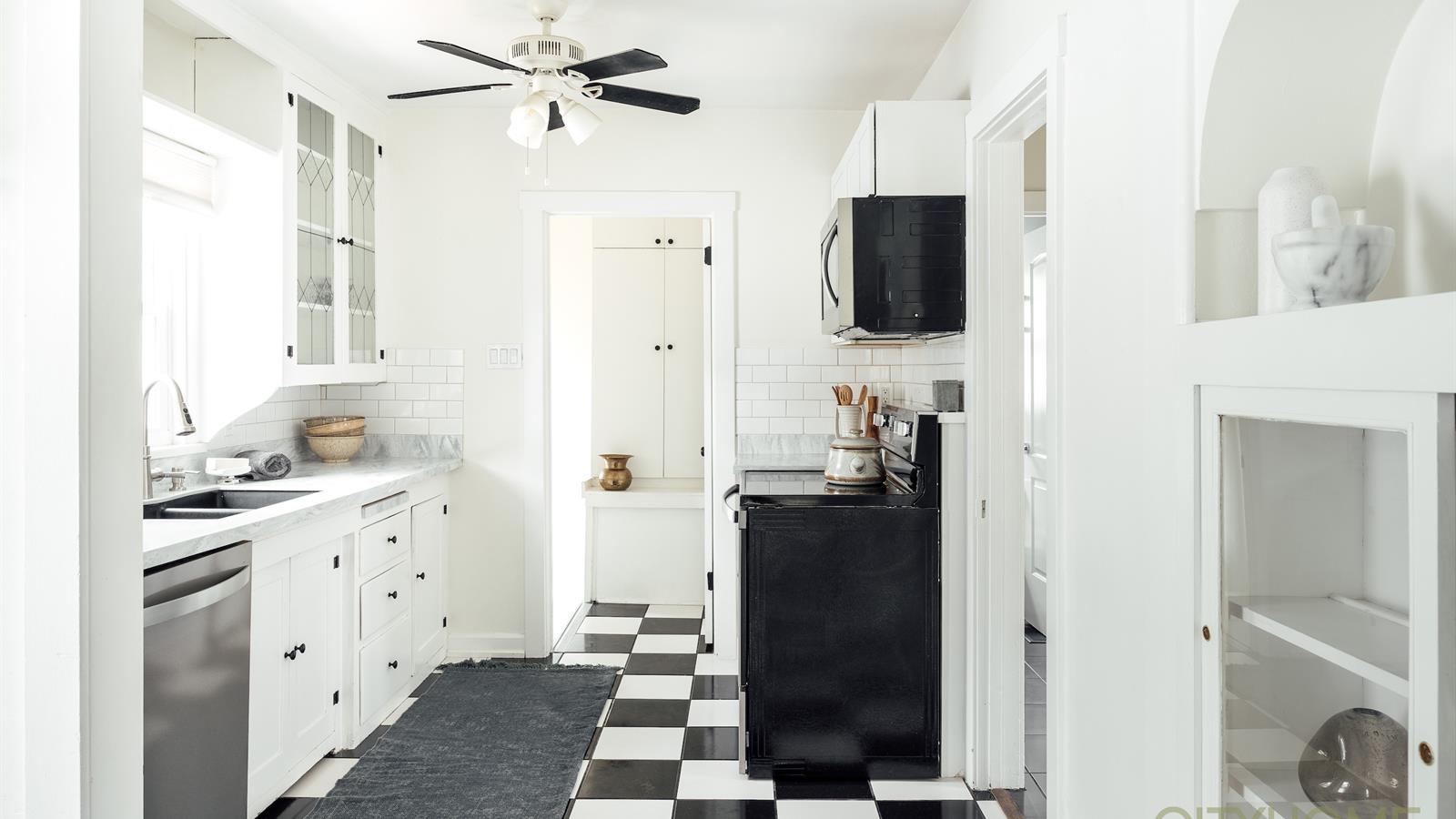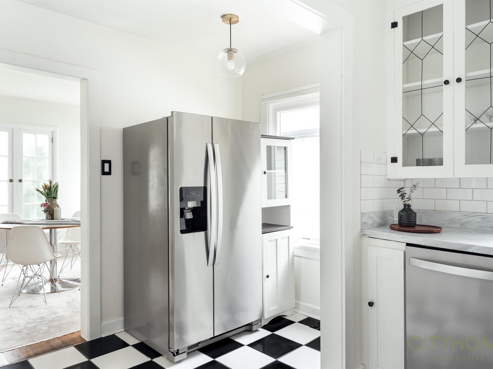 It’s not just the perfect location that makes this cute bungalow so special but also the coziness and the original designs which are noticed as you walk into the front door; the main room has its French windows and hardwood floors that gives it a romantic Paris vibe with a black and white checkered tiled kitchen. The lighting that runs throughout the house is natural, soft and warm, adding to the coziness.