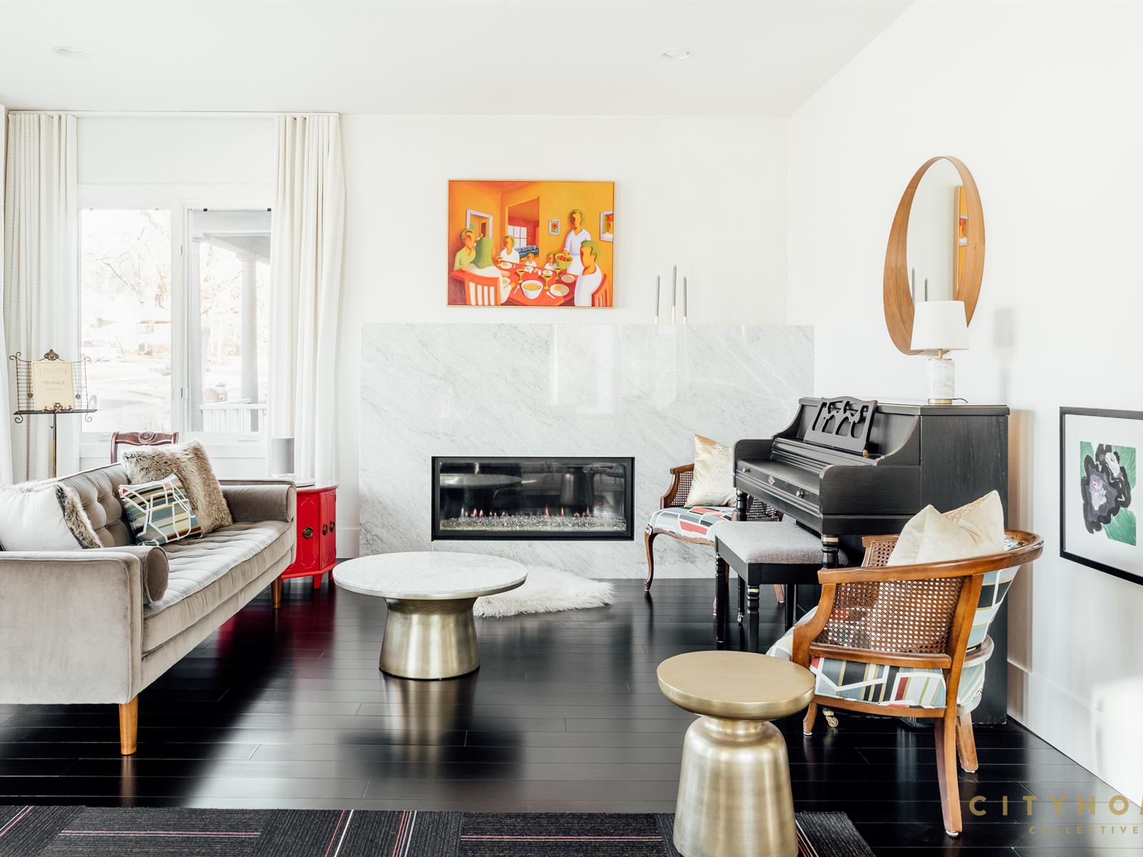 Dark flooring, bright walls, and floor-to-ceiling drapery lend the home a sophisticated feel. The front living space, with its fireplace draped in lovely, cool marble, flows smoothly into the dining room, kitchen, and den. The home office, however, sits perfectly tucked away from daily foot traffic.