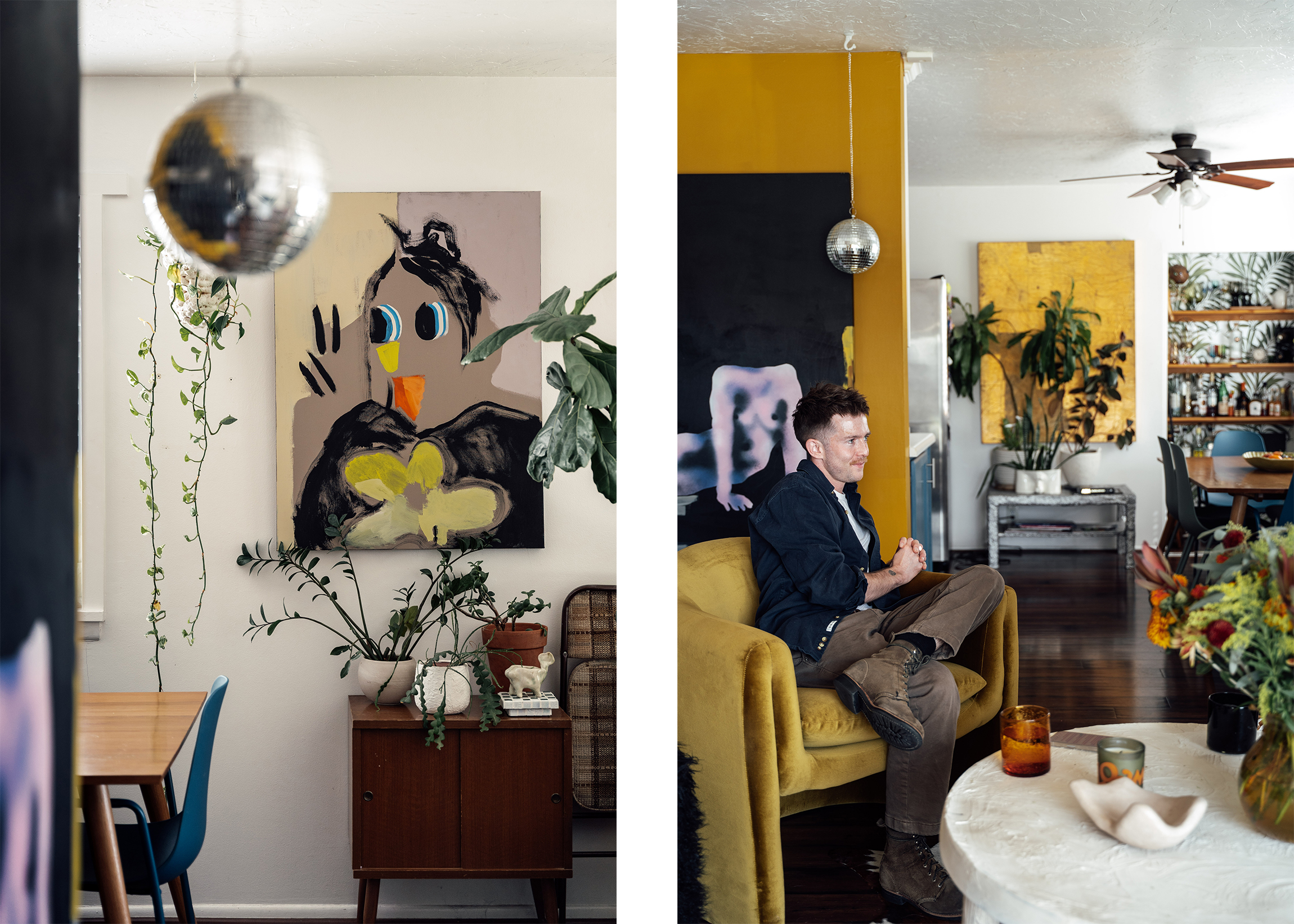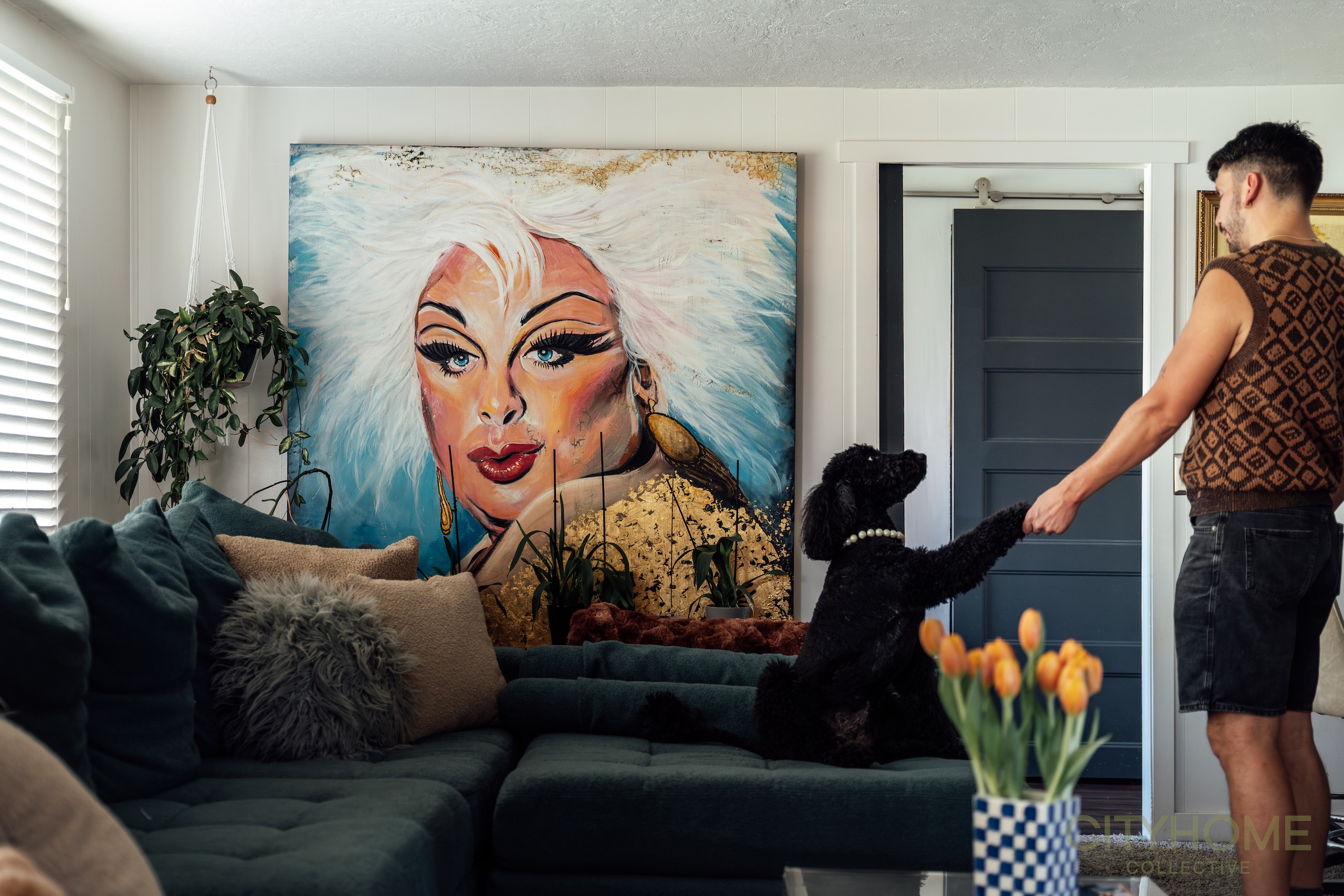One that makes you instantly feel seen, welcomed, and at ease. That’s Douglas’ home. I’ve known him for nearly a decade, and over the years, I’ve watched him transform a house into a living space that radiates life, generosity, and warmth. Several years ago, I helped him find this home, and it has since become a reflection of his magnetic personality. A place where friends gather effortlessly, every corner tells a story, and Margot, his golden doodle, greets you with ample amounts of joy. His passion for gardening fills the yard with color, harvest, and love, and the art (by: Goth Sloth, Jill Whit, Cinnamon Ojeda, & Tanner Allen) and treasures scattered throughout the home are testaments to the care and creativity he pours into his life. In Douglas’ home, comfort isn’t just a feeling, it’s a welcome, an invitation, and a way of life.