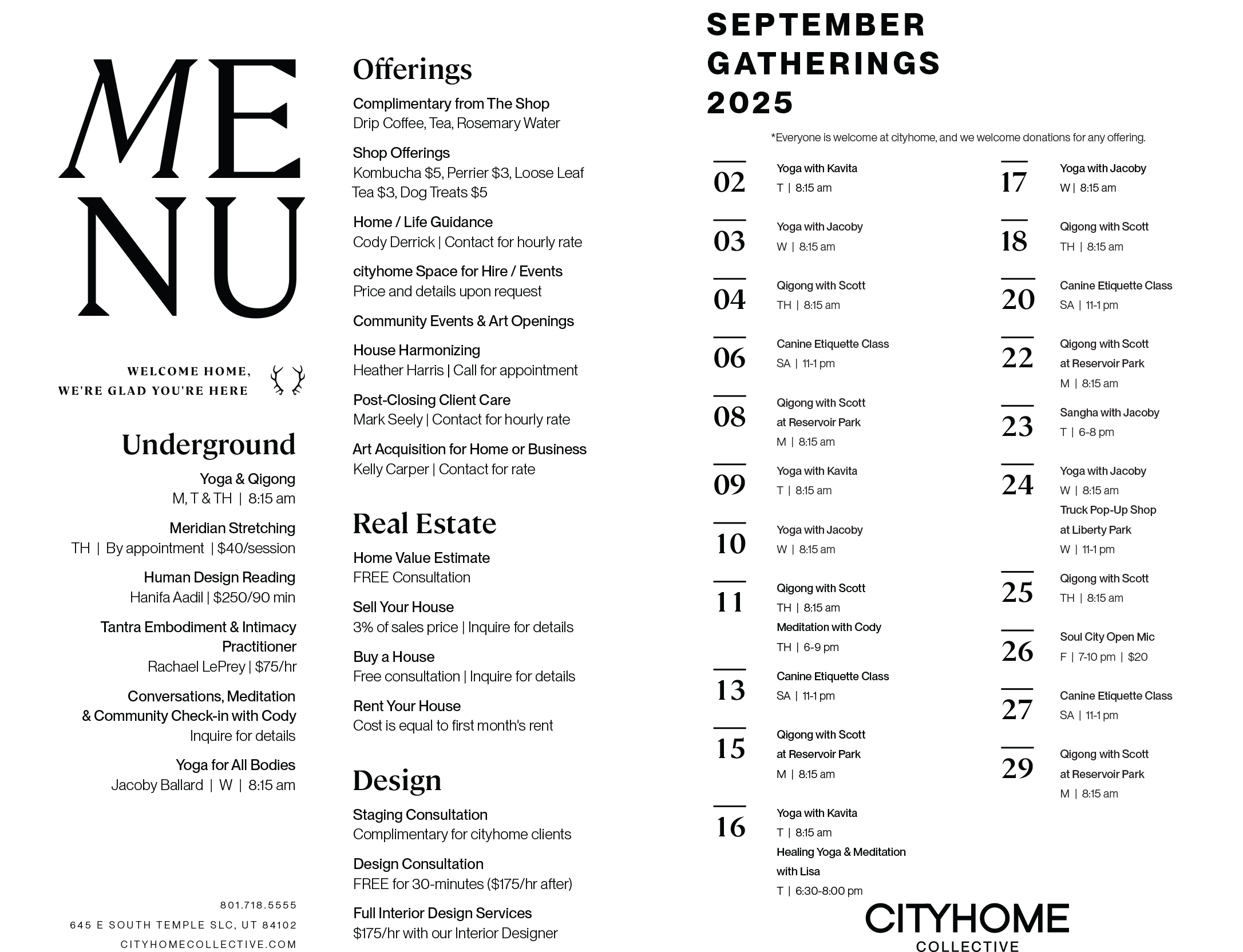 This is why we have been doing our best to point ourselves, our clients and our communities back to the Self. Whether it is embodied movement classes, community meditation groups, house therapy sessions, or first time home buyer classes, we have tended to a holistic approach to real estate, design and good neighbor-ing for almost twenty years. To keep it communal, most of what we offer is spread word of mouth. We have a print menu in our COLLECTIVE homebase that folks can pick up anytime with a current schedule as well as an ever evolving list of services. Stop by and grab one, have a cup of tea or coffee and say hello. Free hugs for the touchers. Warm smiles for everyone. Or check the newsletter at the beginning of each month for a snapshot of what is hot off the press. Spoiler alert. It's us. And we are at your service. Happy September, friends. What a beautiful month to be alive in this city, we call 'home'.
