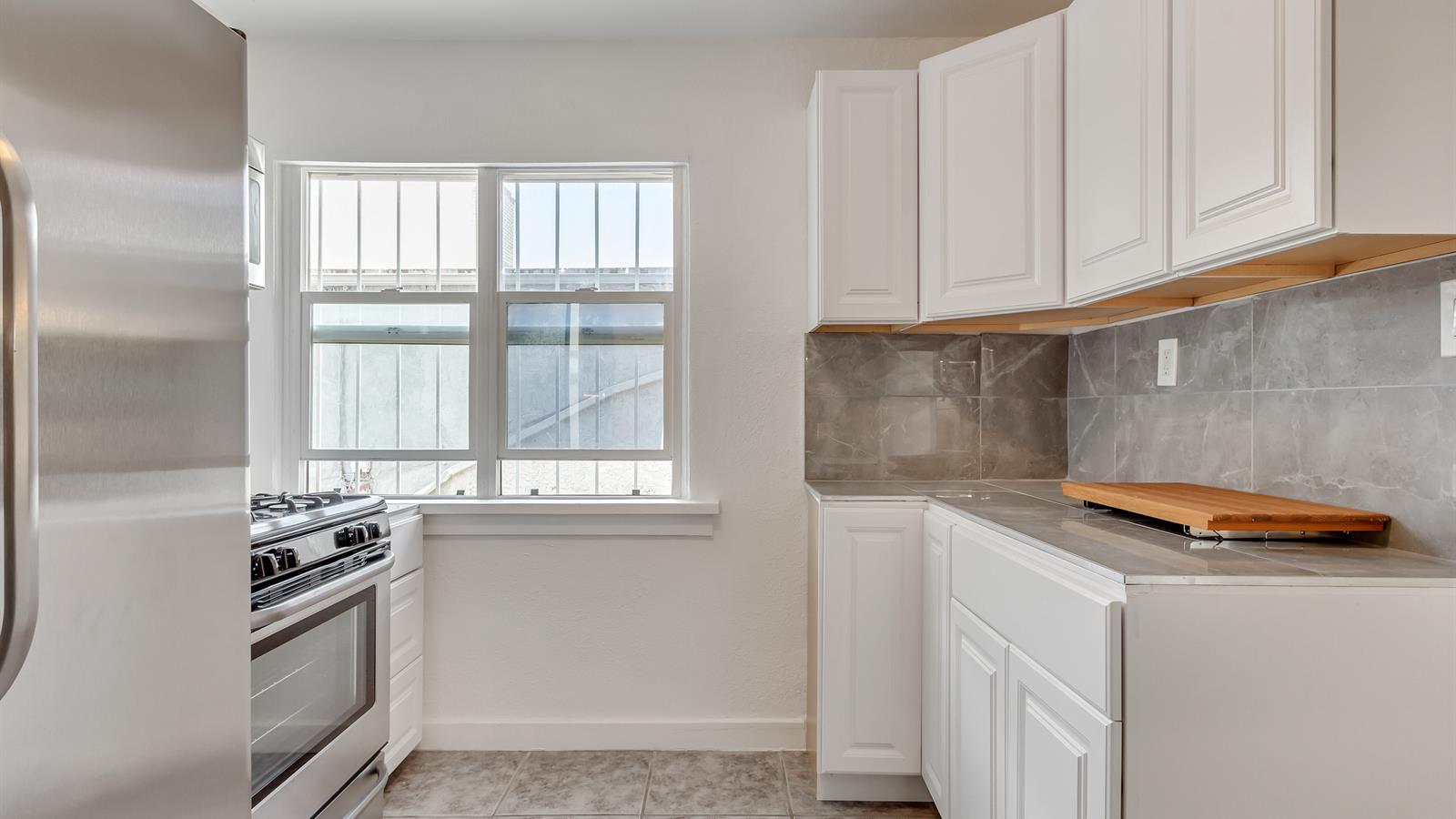 The newly updated kitchen follows suit with this austere-but-pleasant scheme, and also boasts entirely updated stainless steel appliances.