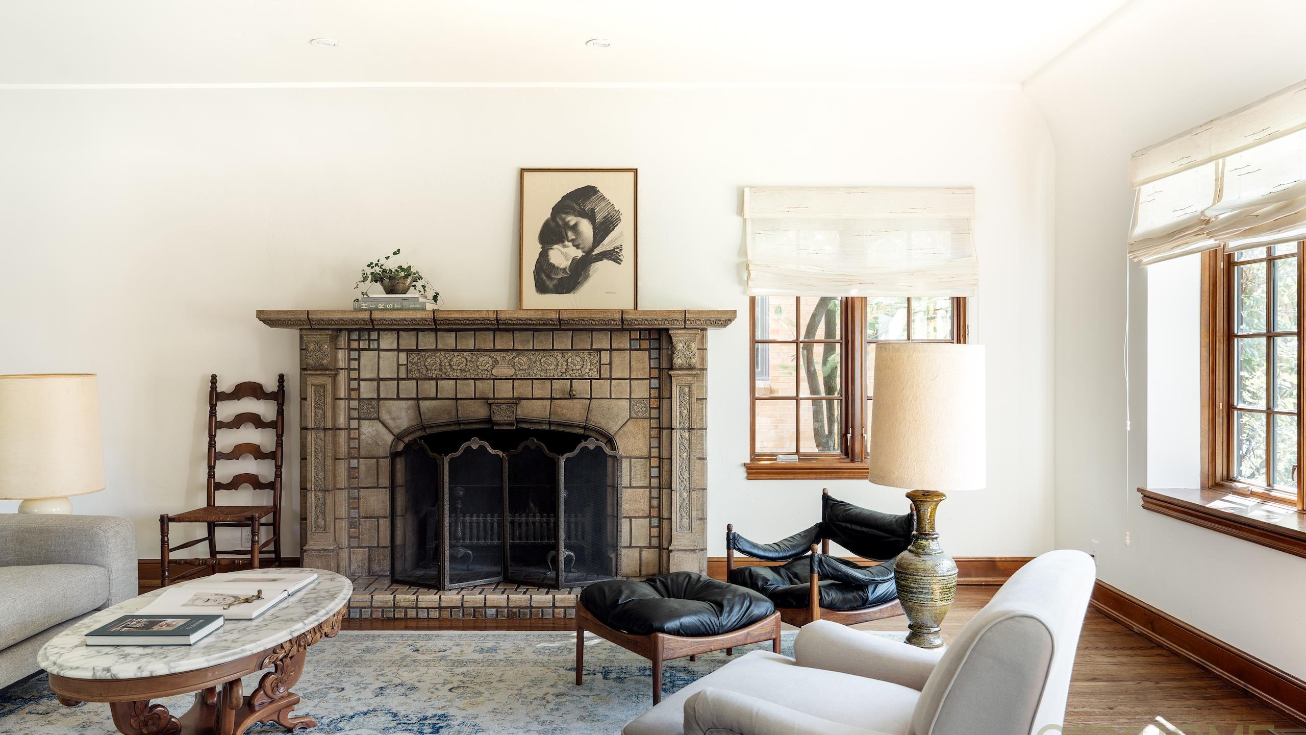 The heart of the home is its fireplace. Made of earth-toned Batchelder tiles, it radiates warmth and durability.