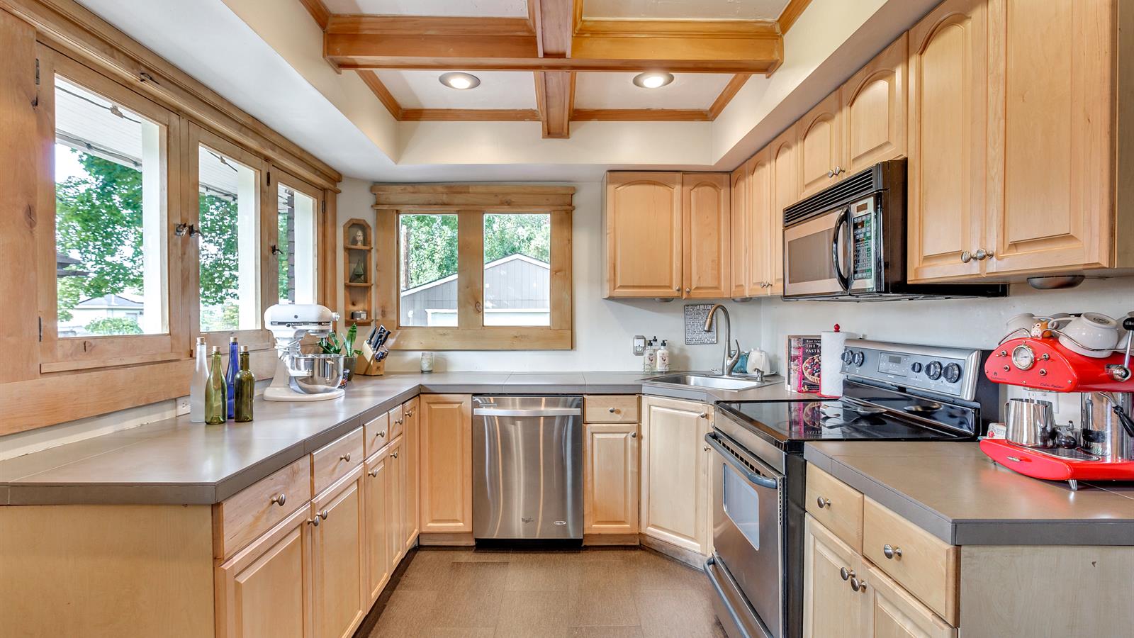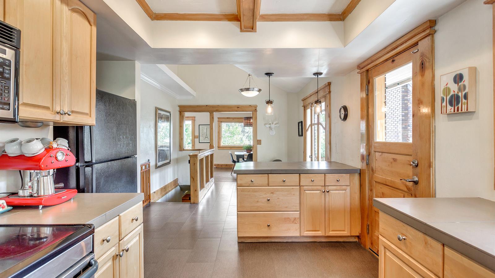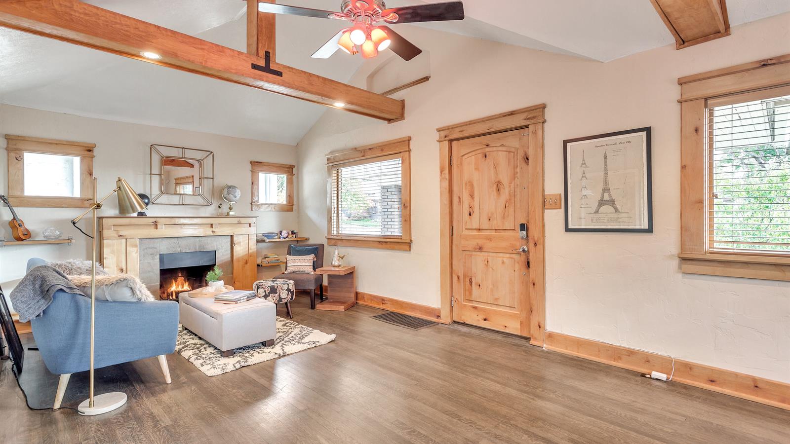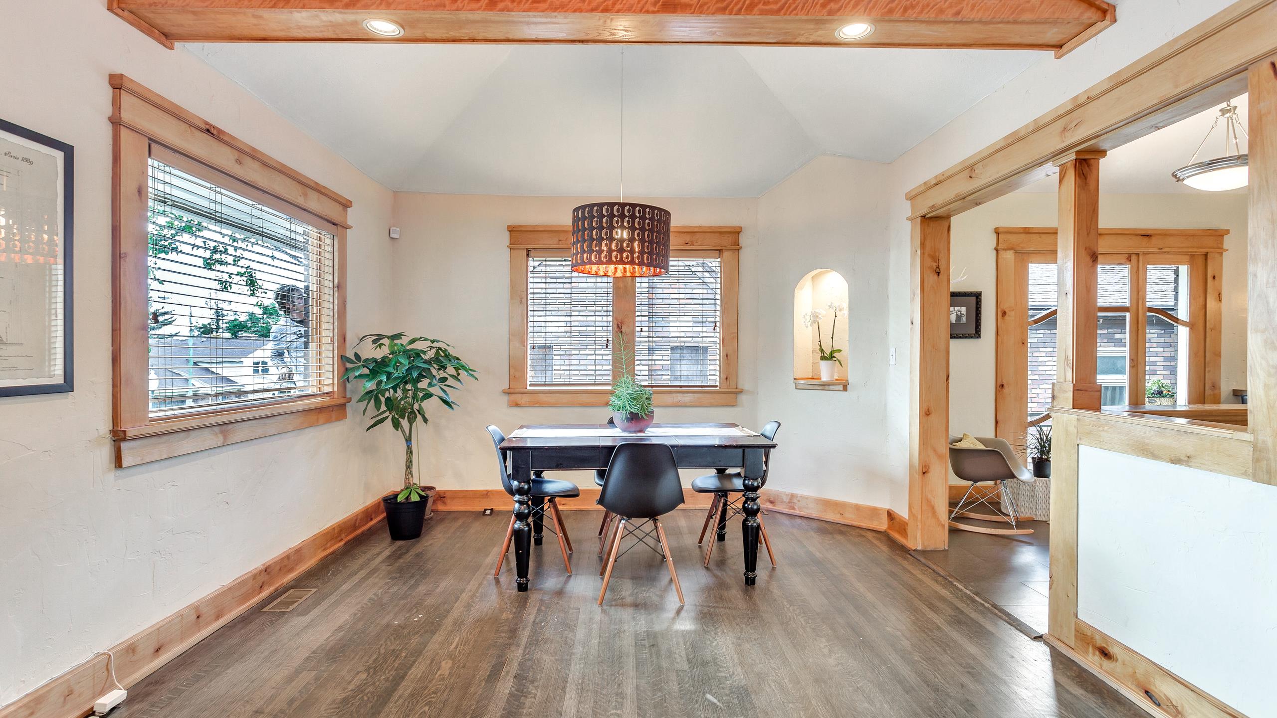 The inside is tastefully updated and awash in natural light, and those high ceilings and exposed oak beams make this space feel plenty big.