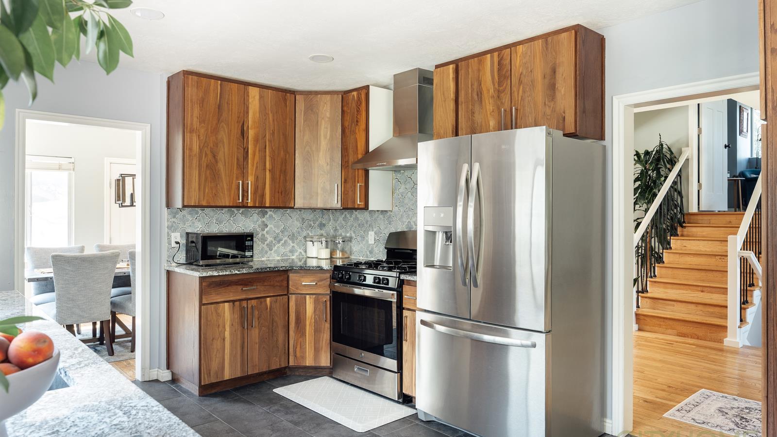 think vintage vibes meets modern magic, complete with custom upgrades. Natural light floods the main level, featuring original hardwood floors and an open layout with space for an office nook or sitting area, living room with cozy fireplace, and spacious dining area. At the heart is the completely remodeled kitchen - from its sleek walnut cabinets to its stylish slate floor and granite countertops - with all new appliances and lighting.