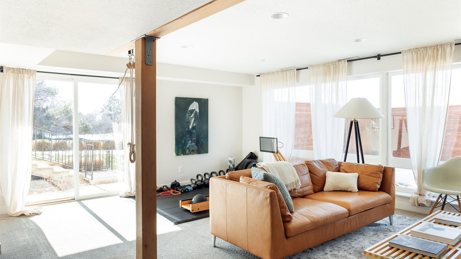 Elements such as floor to ceiling windows and exposed beamwork create a space that intimately connects the indoors to the out.