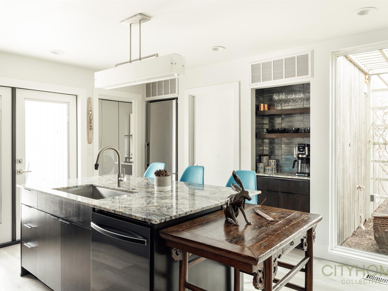 The kitchen has been redesigned and relocated and now boasts a new gas range, new cabinetry, new granite counters and stainless steel appliances. New flooring runs throughout the home along with new sheetrock, new, solid-core doors, and new plumbing. The electrical is also new with increased amperage to the home via a new panel. The windows and doors are all high efficiency and, adding architectural detail and functionality, 6 new floor-to-ceiling windows were added.