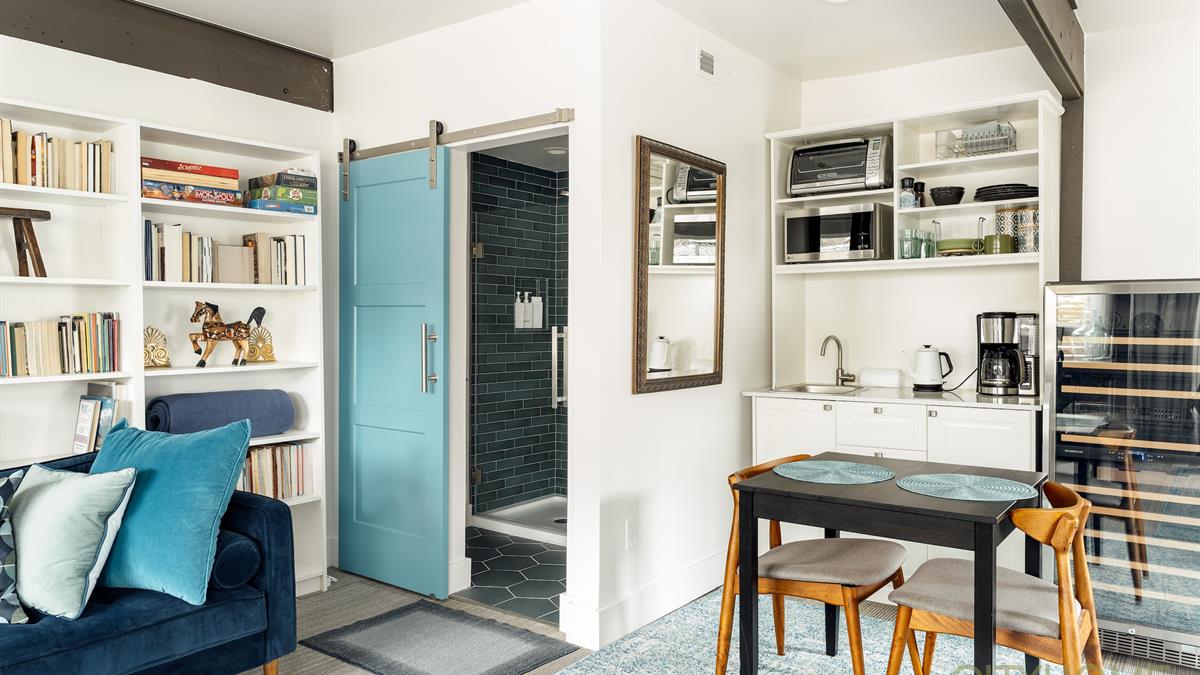 A wonderful surprise: the garage has been converted into a charming apartment, complete with its own Murphy bed, kitchenette, bathroom and a pair of french doors leading out to a private patio. It’s the perfect addition for guests or home office or even an art studio.