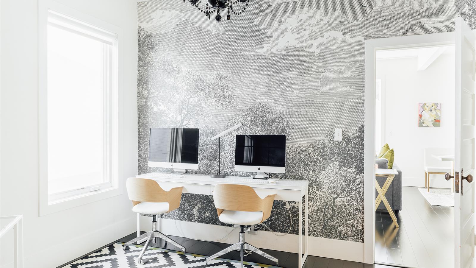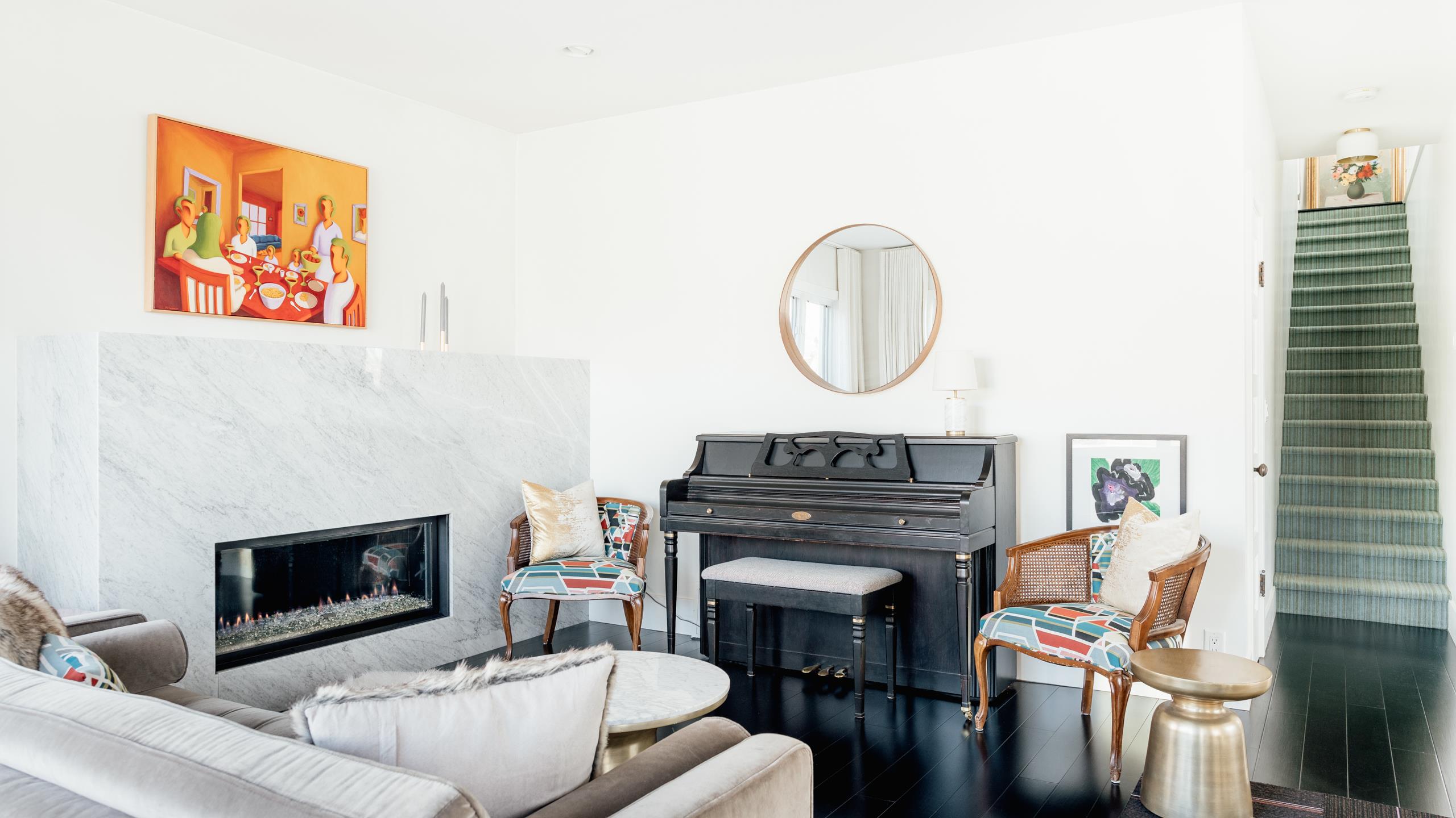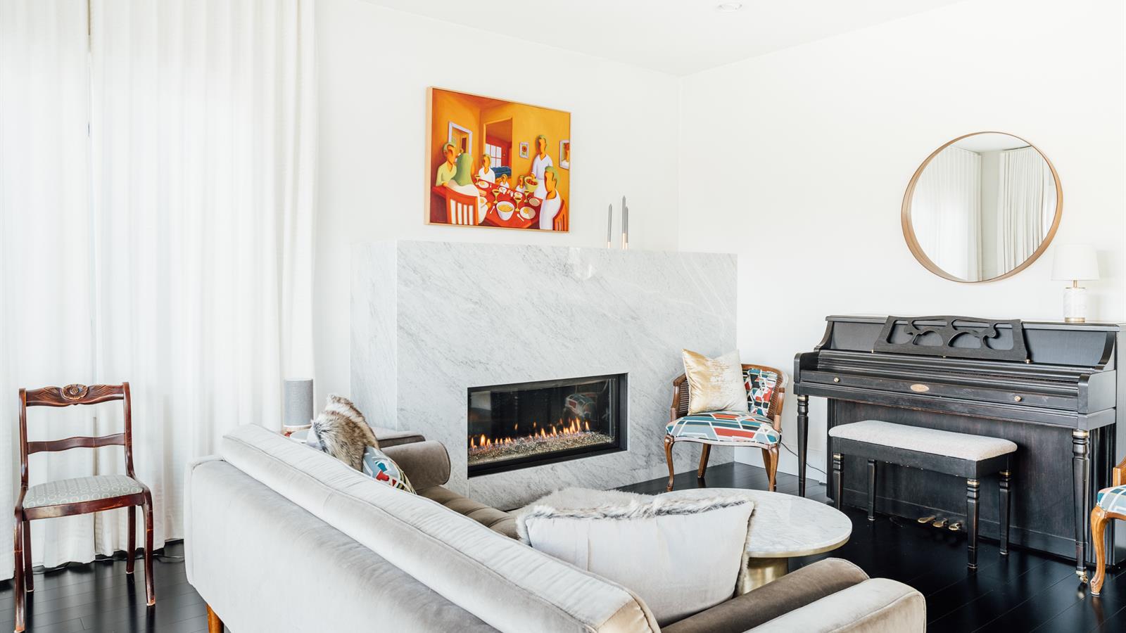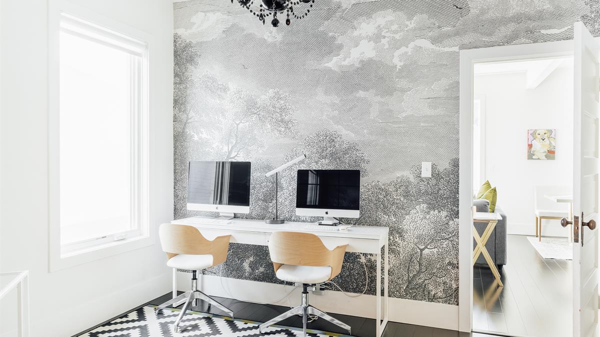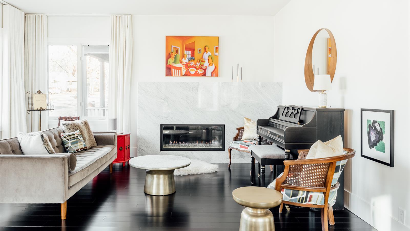 Dark flooring, bright walls, and floor-to-ceiling drapery lend the home a sophisticated feel. The front living space, with its fireplace draped in lovely, cool marble, flows smoothly into the dining room, kitchen, and den. The home office, however, sits perfectly tucked away from daily foot traffic.